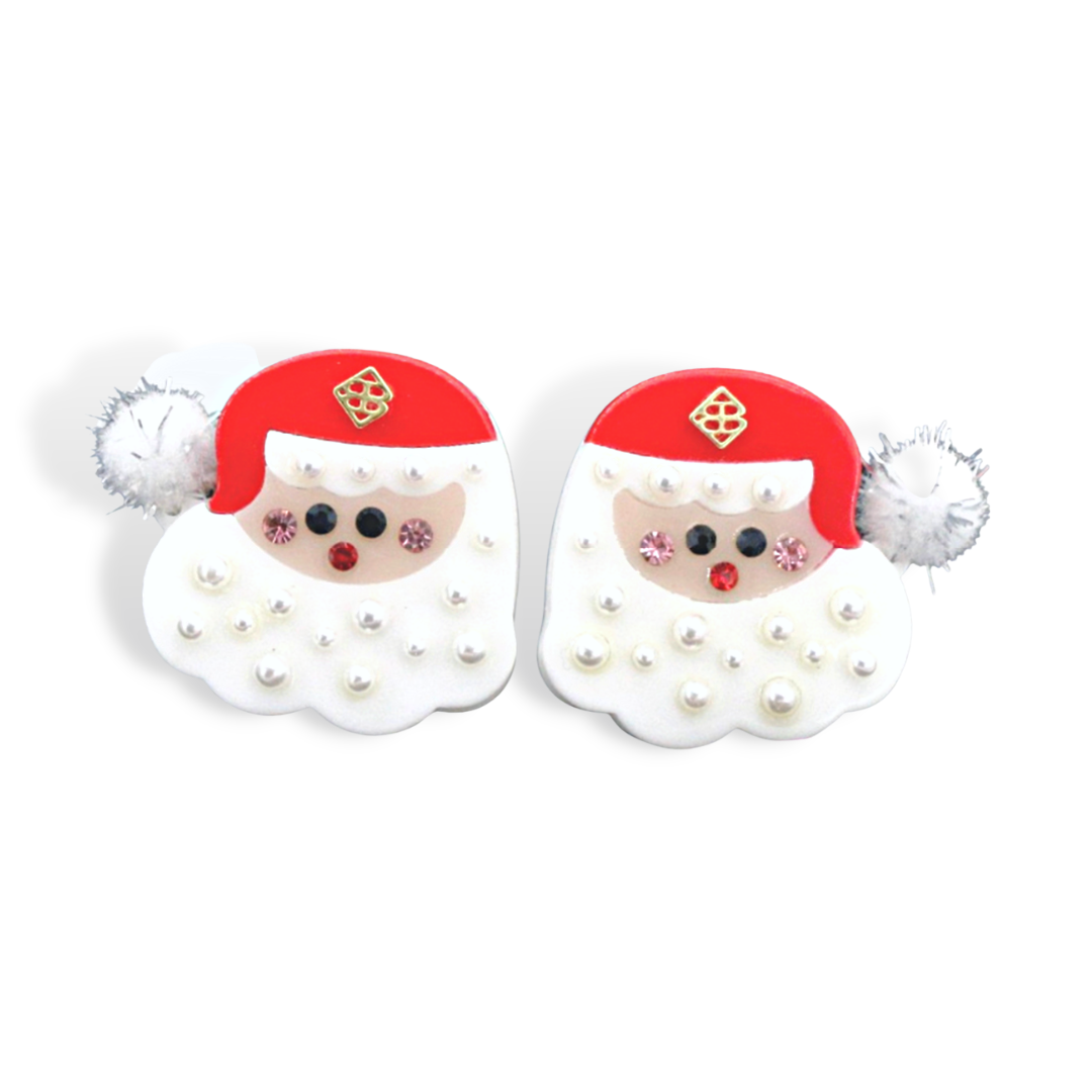 - Red Christmas Santa Earring with pearls, crystals, and fuzzy ball on his precious hat