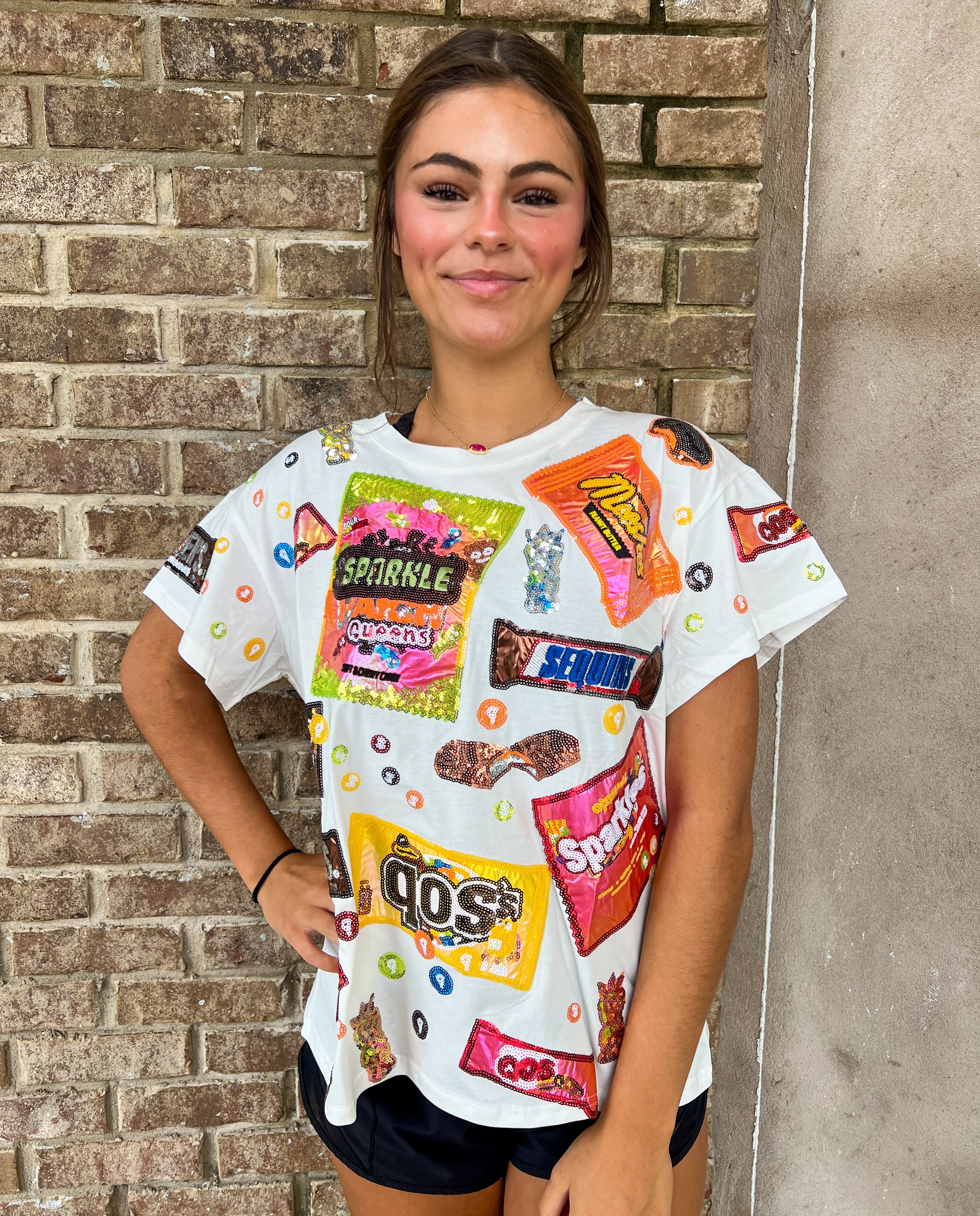 Get ready to reign supreme this Halloween with our Queen of Sparkles: Queen of Candy Tee! This fun and playful t-shirt will have you looking like the ultimate queen of the holiday, with a touch of sparkle and sweetness. Rule the night with this quirky and unique tee!