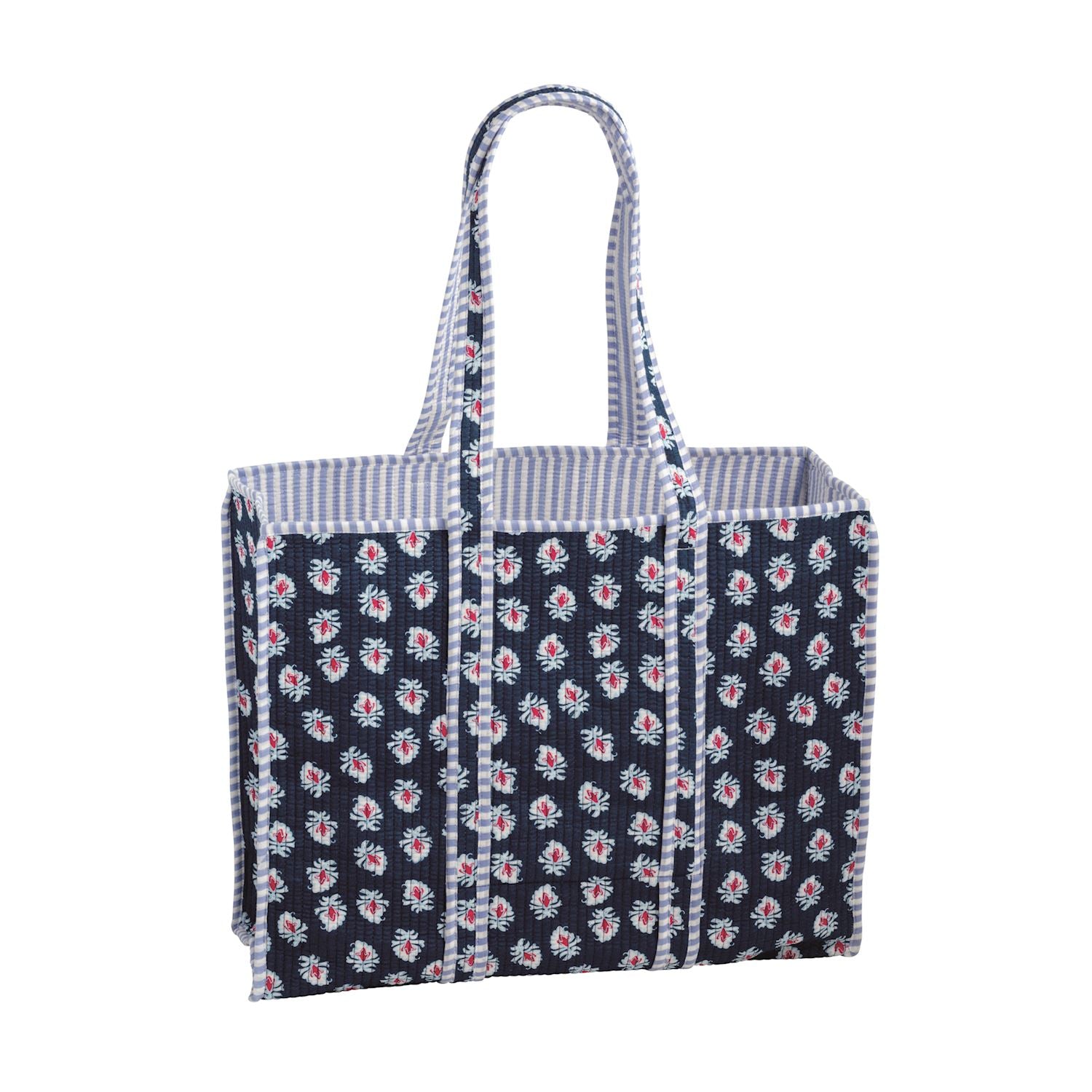 Carry your essentials in style with this charming Americana Block Print Tote. Crafted from quilted cotton, it features a striking block print design paired with contrast stripe binding that adds a pop of personality. The lined interior keeps your belongings organized, while a handy interior pocket keeps smaller items within easy reach. Perfect for shopping, beach days, or everyday adventures—this tote blends practicality with vintage-inspired flair.