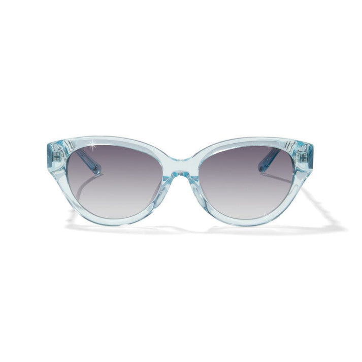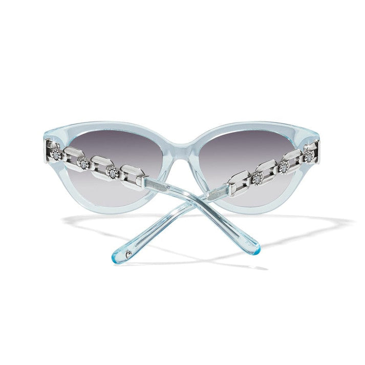 This flattering new shape is an oval with a cat eye feel - super feminine and fun. The temple is a modern and bold link design adorned with the classic "Twinkle" crystal design on the smaller links. Its "Ocean Water" color is a transparent pale blue shade that is soft on the face, easy-on-the-eyes, and super on-trend.