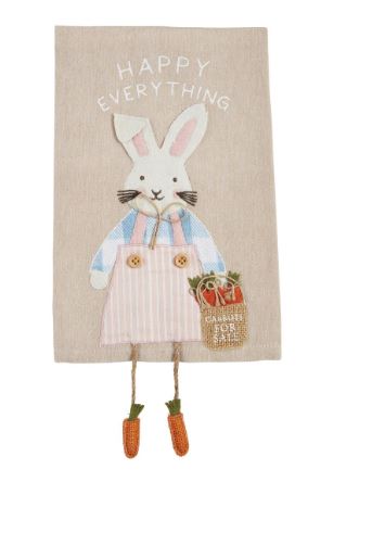 Embellished and appliqued chambray or cotton hand towel with jute rope dangle legs.