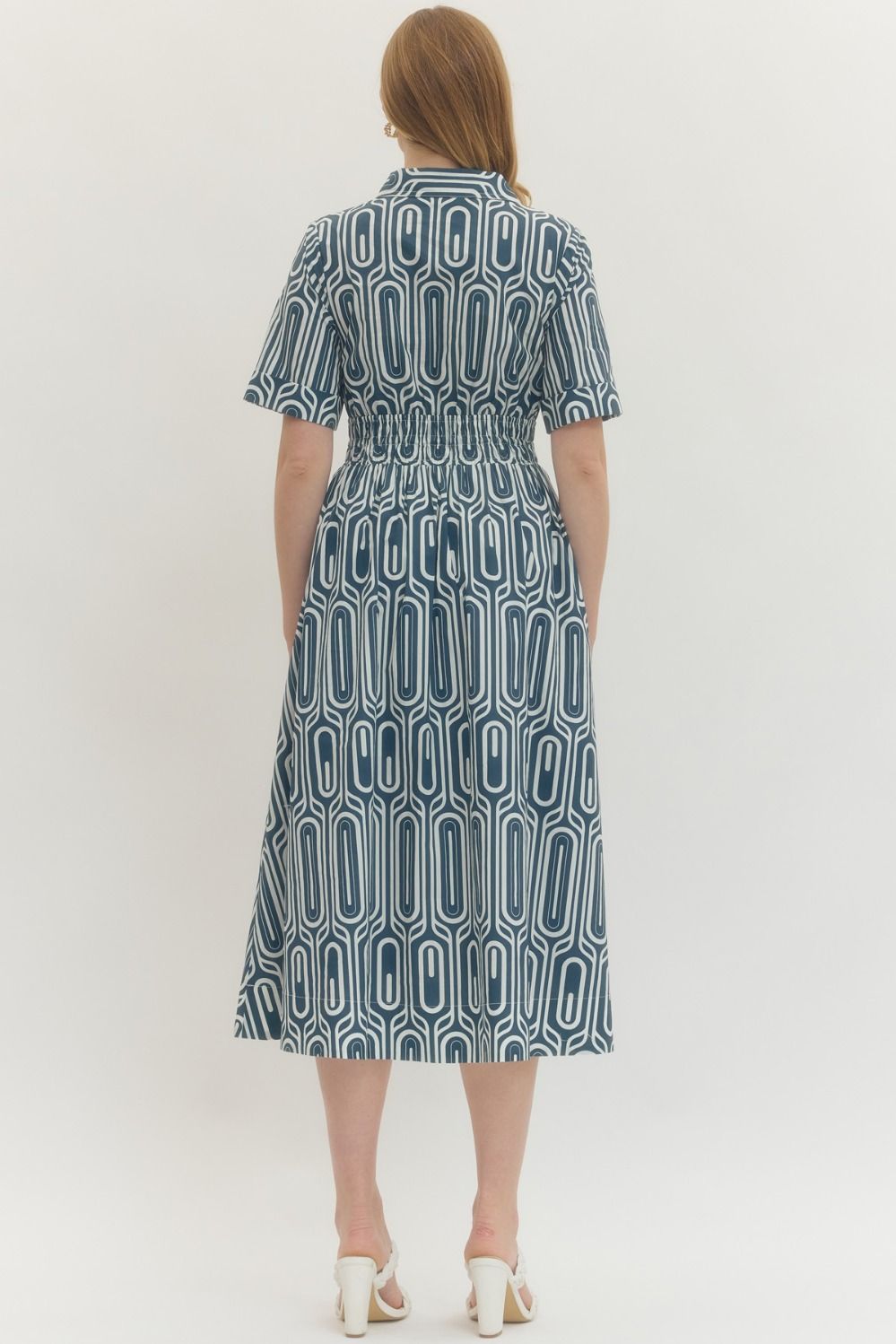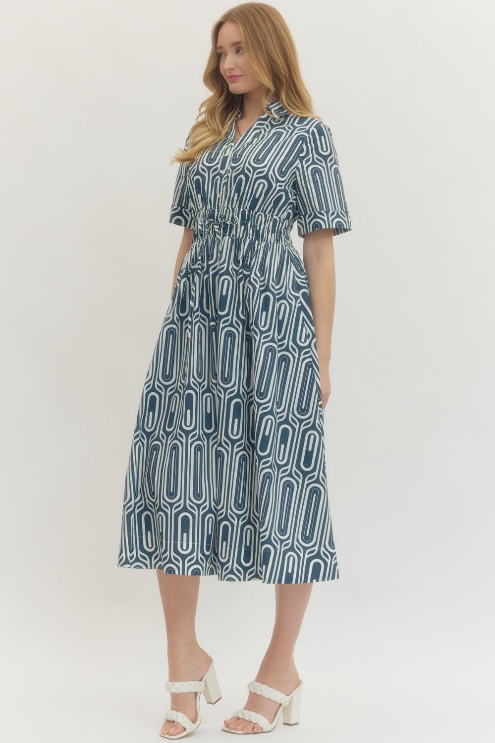 Introducing the Nakia—a geometric print midi dress that's equal parts fun and functional! This navy beauty features a flattering smocked waist that hugs you just right, paired with a convenient front button closure for easy dressing. Slip your hands into the side pockets (yes, real pockets!) and enjoy the lightweight, woven fabric that moves with you all day. Fully lined and non-sheer, this dress is ready for anything from casual outings to weekend adventures. Simple, stylish, and seriously comfortable.