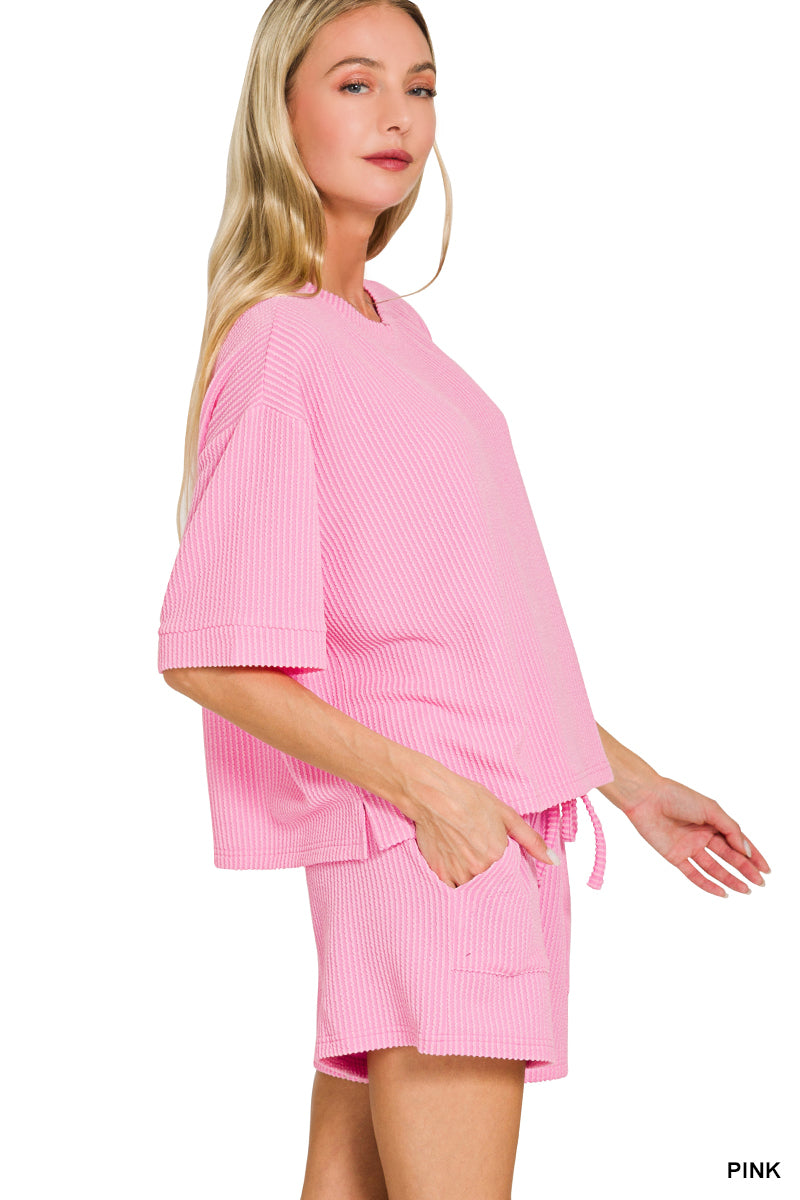 Harlow Ribbed Short Sleeve Short Set • Pink