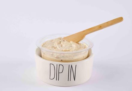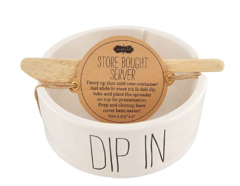 Ceramic dip bowl is perfectly sized to hold cold case dip containers. Comes with wood spreader.