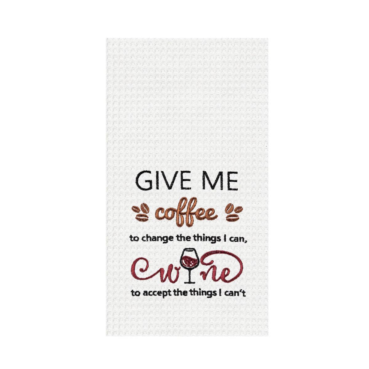 This kitchen towel is crafted of cotton fabric and embroidered with a coffee and wine themed design - perfect for adding a touch of whimsy to your kitchen's decor.Product dimensions are 18in x 27in. Made of cotton.