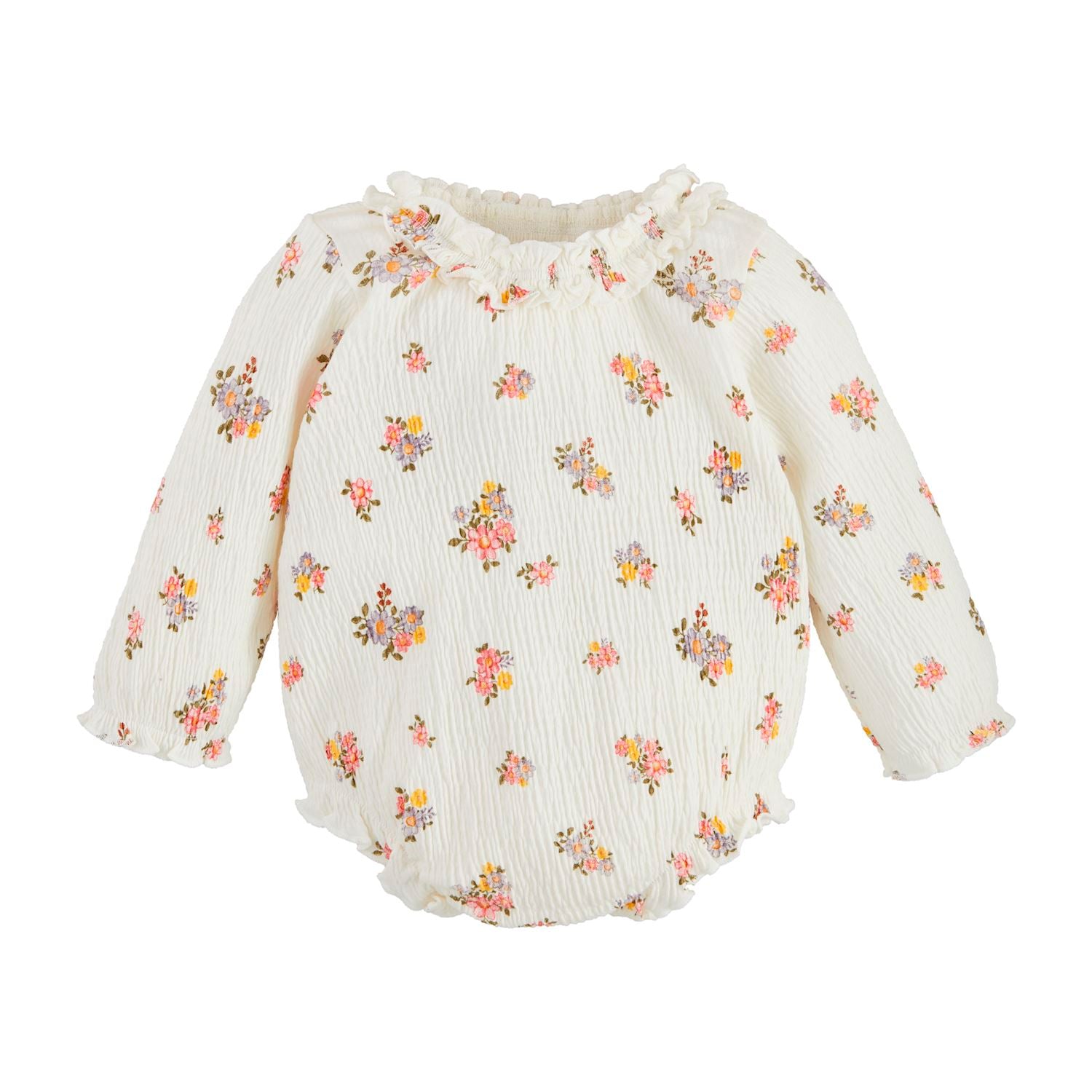 The Crinkle Knit Floral Bodysuit is a charming and stylish piece designed for your little one. Crafted with a delicate crinkle knit texture, this bodysuit features long sleeves to keep your baby cozy and comfortable. The elegant ruffle trim detail adds a touch of sophistication and whimsy, making it perfect for any occasion. Convenient inner leg snaps ensure easy diaper changes, providing practicality for parents. Available in size 0-3 months, this bodysuit is made from a soft and breathable blend of 97% cotton, 2% polyester, and 1% spandex, ensuring a gentle fit against your baby's skin while allowing for a slight stretch for added comfort.