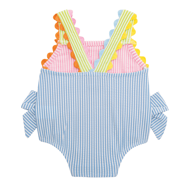 This adorable Seersucker Bow Baby Swimsuit is designed to keep your little one stylish and protected during sunny days at the beach or pool. Crafted from a high-quality blend of 50% Polyester, 45% Nylon, and 5% Spandex, this one-piece swimsuit offers a comfortable and flexible fit for your baby. The charming seersucker fabric adds a classic touch, while the ric-rac straps and cute bows at the hips provide delightful details that enhance its overall appeal. Featuring convenient inner leg snaps, this swimsuit ensures easy diaper changes without compromising on style. With a UPF 50+ rating, it offers excellent sun protection, keeping your baby's delicate skin safe from harmful UV rays. Perfectly sized for 3-6 months, this swimsuit is an essential addition to your baby's summer wardrobe, combining functionality with adorable design.