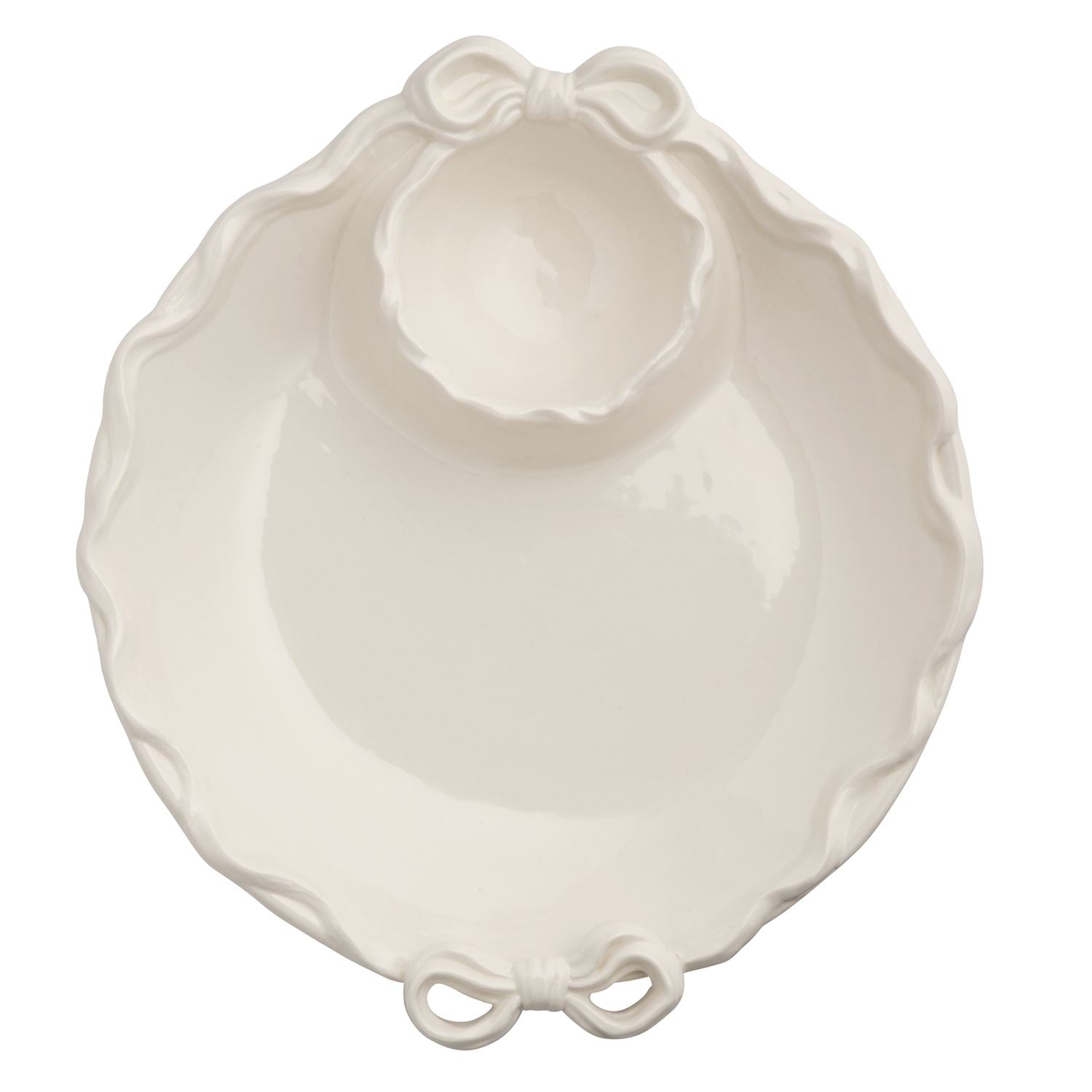 Serve up snacks in style with this charming ceramic chip and dip server. The integrated dip cup keeps your favorite dip front and center, while the decorative bow and ribbon detailing along the rim adds a touch of whimsy to any gathering. Perfect for parties, game nights, or everyday entertaining—a functional piece that doubles as table décor.