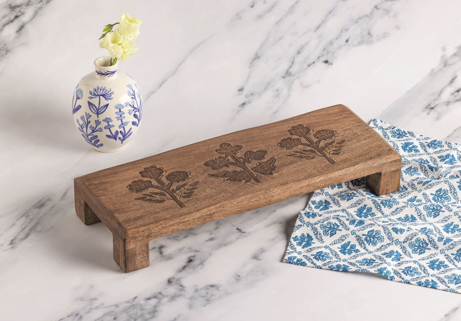 Serve up style with this charming mango wood board, where rustic elegance meets everyday function. Hand-engraved florals dance across the surface, while sturdy feet keep it perfectly positioned on your table. Whether you're hosting a charcuterie night or displaying fresh pastries, this board brings warmth and whimsy to any gathering. A natural beauty that's as practical as it is pretty.