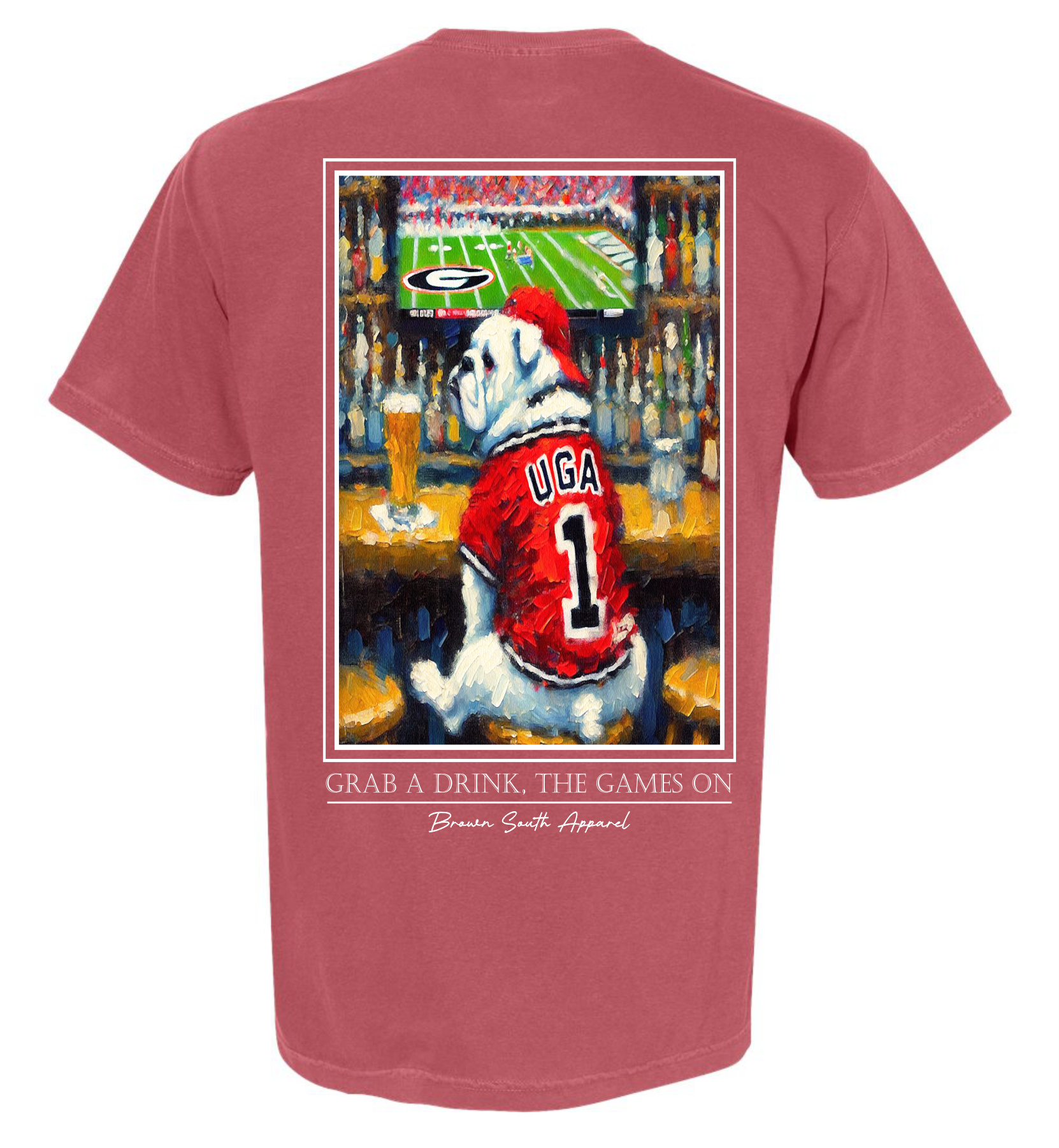Show your game day spirit with the Grab A Drink Dawgs Tee in Brick. Featuring a portrait of a bulldog enjoying a drink at the bar while watching the game, this playful tee invites you to relax and cheer on your team. Perfect for casual wear, it combines comfort with a fun, sporty vibe that’s sure to be a hit at any gathering.