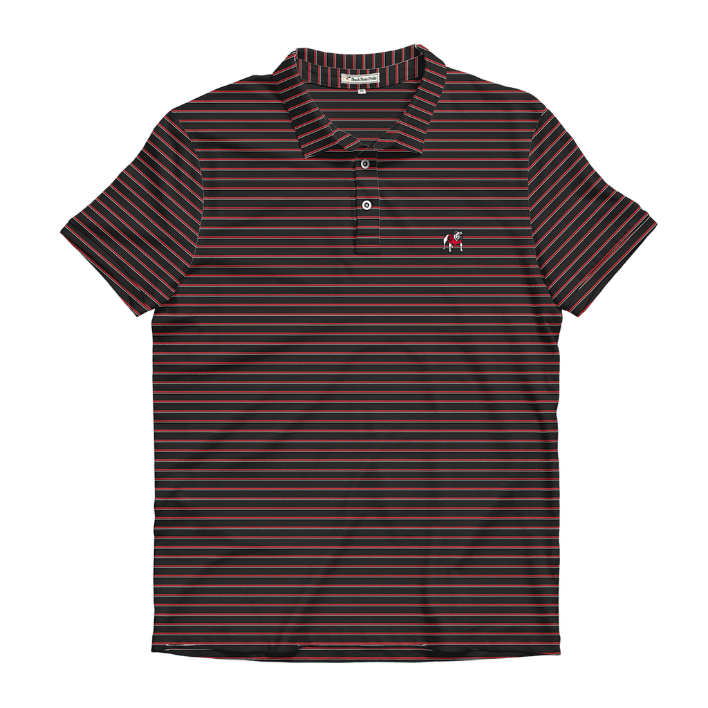 The Peach State Pride Black, White, & Red Poplar Stripe Polo features the University of Georgia's Standing Dawg left chest embroidery. Perfect for UGA football gamedays!