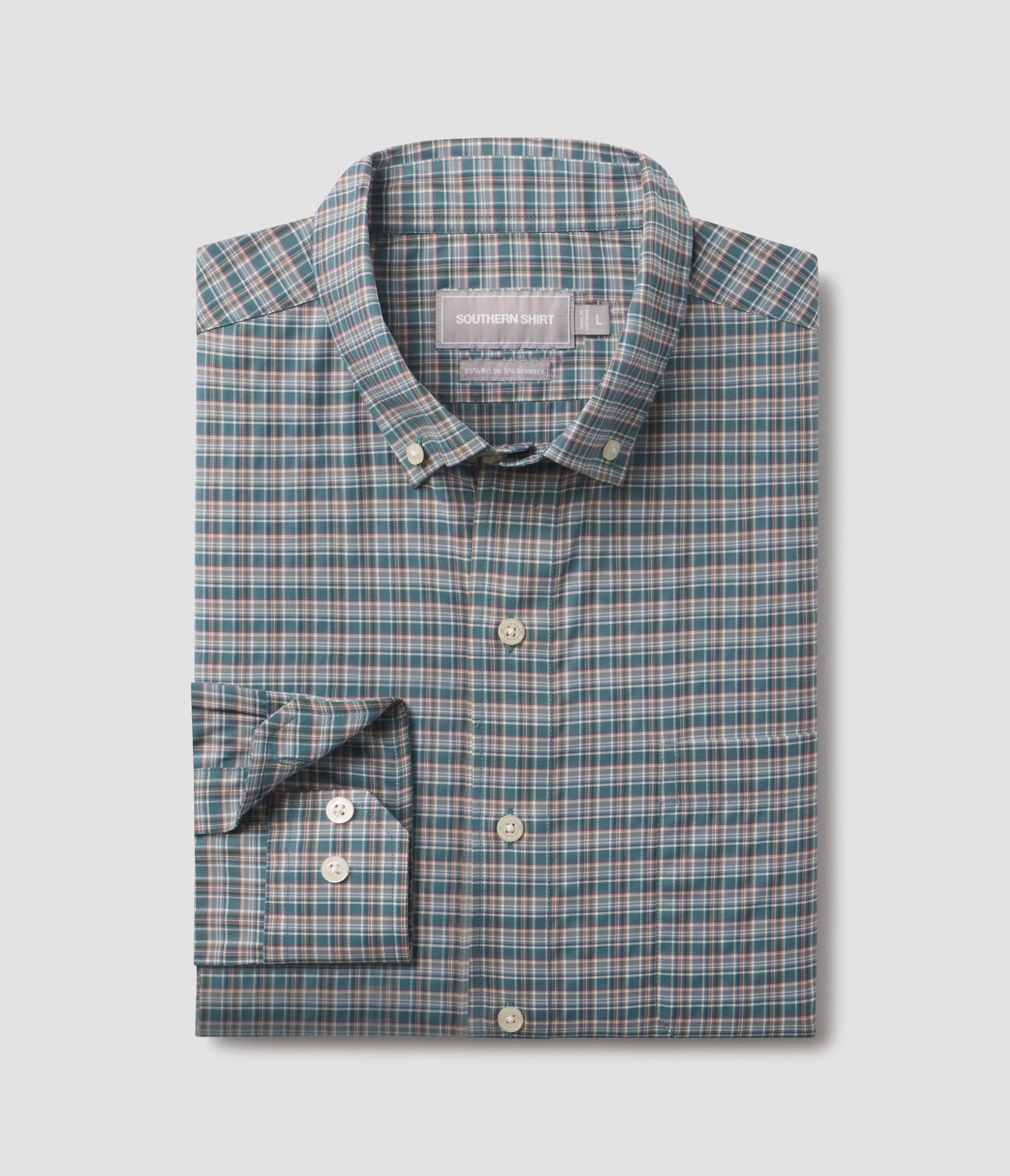 Crafted from a 95% nylon / 5% spandex yarn-dyed poplin, it features 2-way stretch, moisture-wicking, quick-dry technology, and wrinkle resistance—making it a reliable choice for travel days, tailgates, or business casual. A button-down collar, mitered cuffs, and tapered tuckable hem bring in clean lines, while the front chest pocket and embroidered side gusset add thoughtful detail. Unique in-house check patterns set this one apart from every other shirt in your closet.