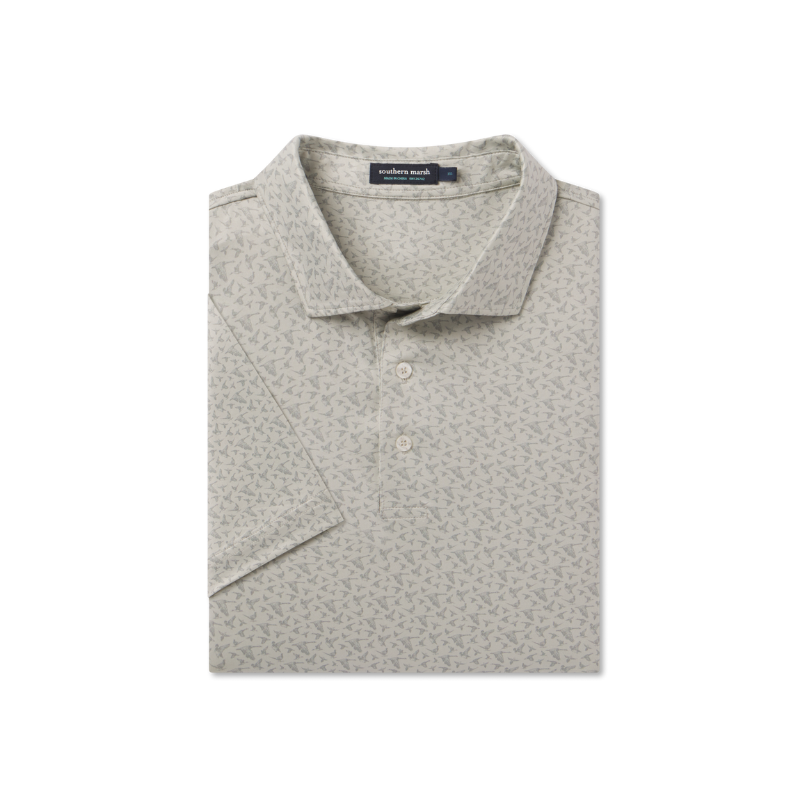 Boasting an all over micro print of birds in flight, our Flyline Performance Polo - In Flight is crafted from a quick dry, moisture wicking fabric and is made for the outdoorsman and businessman alike. The 4-way stretch fabric blend and classic style smoothly transitions from social gatherings to client meetings.