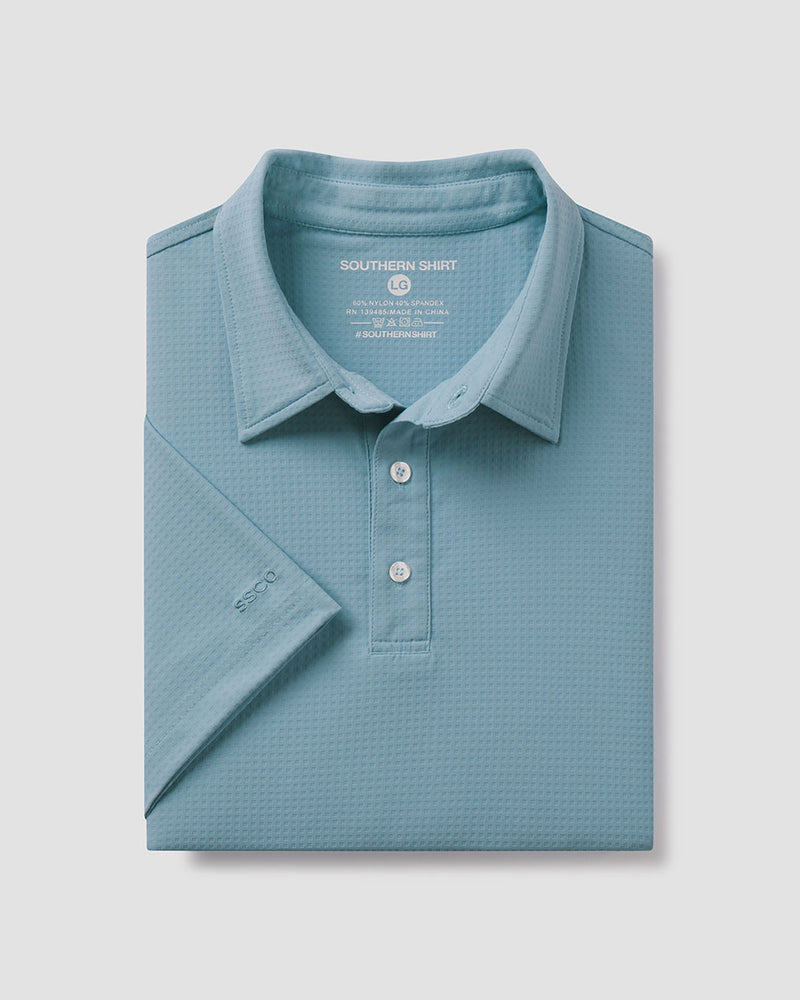 Designed with a textured waffle knit and crafted from a premium nylon/spandex blend, this performance polo delivers cooling comfort, breathable stretch, and year-round versatility. The thermo-regulating grid texture promotes airflow to keep you comfortable, whether you're court side, course-bound, or clocking in.