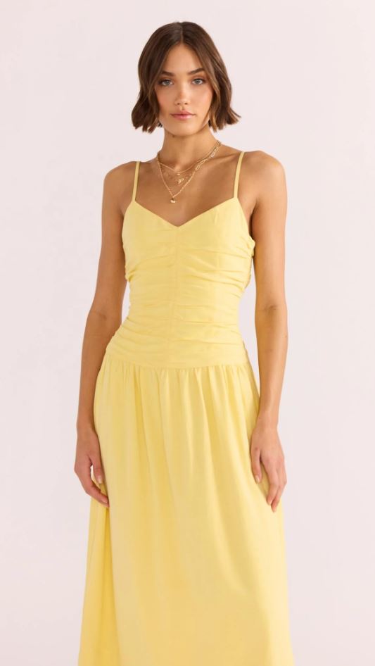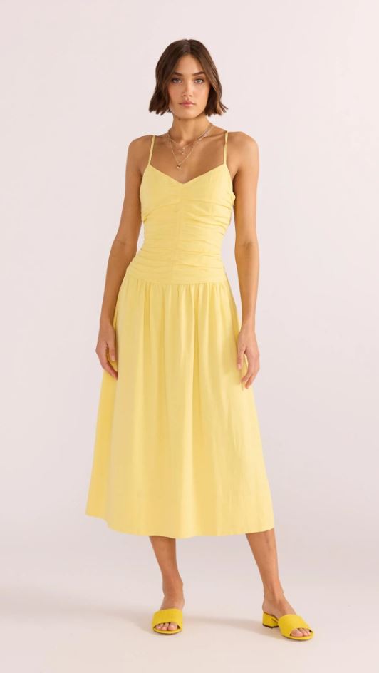 Exude freshness this season, with the new-in Ophealia Ruched Midi Dress by MINKPINK. Featuring a statement lemon hue, and a breezy linen blend fabrication. Wear yours with a neutral mule to complete the look.