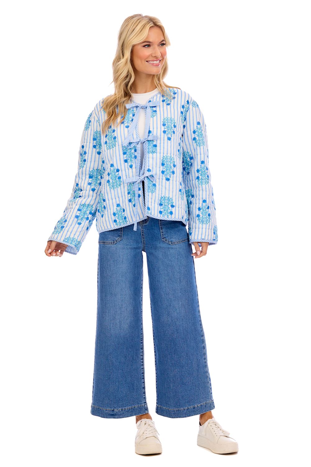 The Teller Quilted Jacket is a stylish and versatile addition to any wardrobe, crafted from lightweight cotton voile for a comfortable and breathable fit. This jacket showcases a unique design with contrast stripe ties and trim, adding a touch of elegance and sophistication. Perfect for layering, it provides warmth without the bulk, making it ideal for transitional weather. The jacket is meticulously crafted with a 100% cotton shell, lining, and filling, ensuring softness and durability. Available in two convenient sizes, S/M and M/L, it offers a flattering fit for various body types. Whether you're dressing up for a casual outing or need an extra layer for a chilly evening, the Teller Quilted Jacket is the perfect choice for effortless style and comfort.