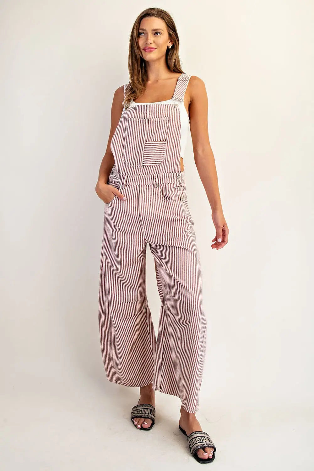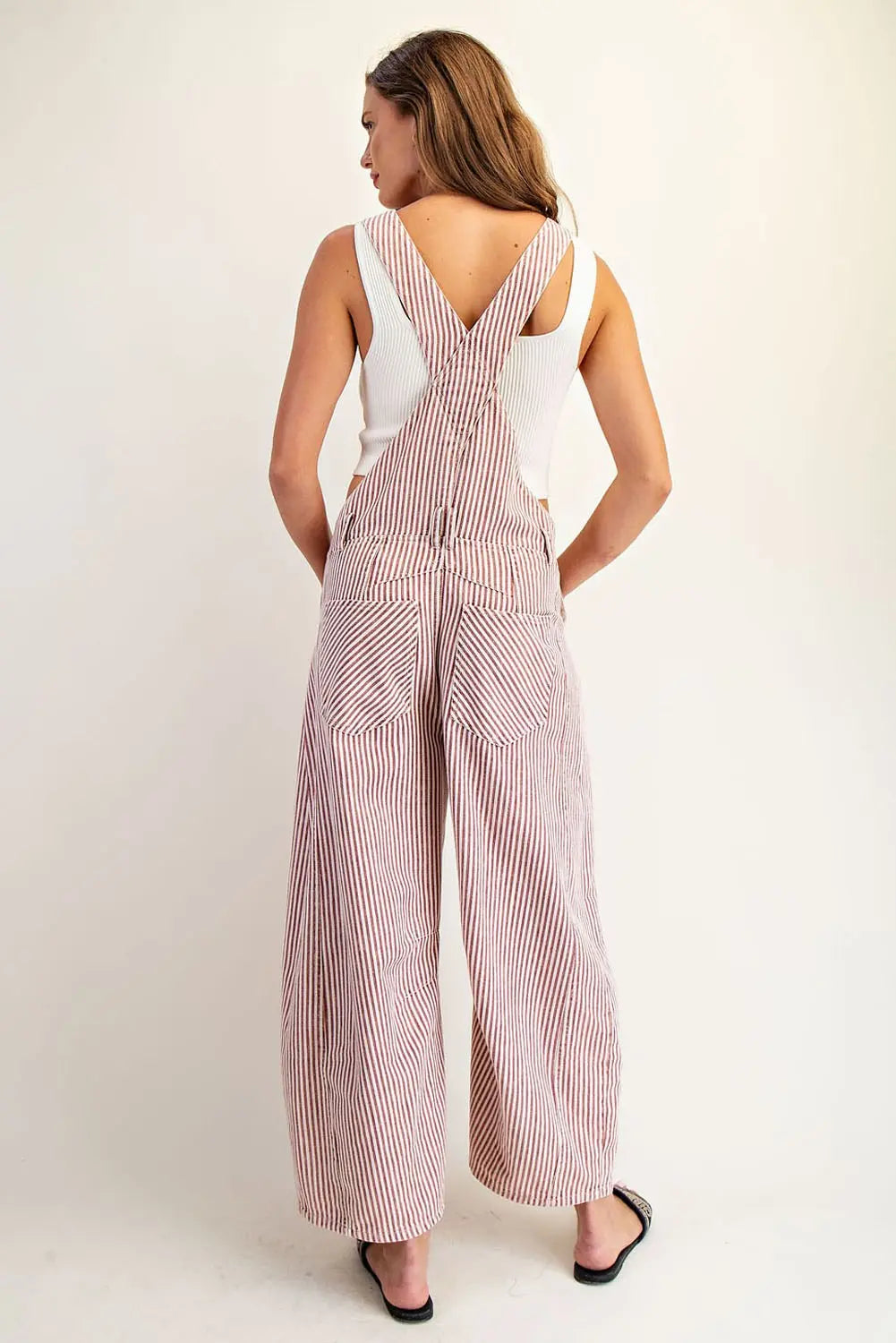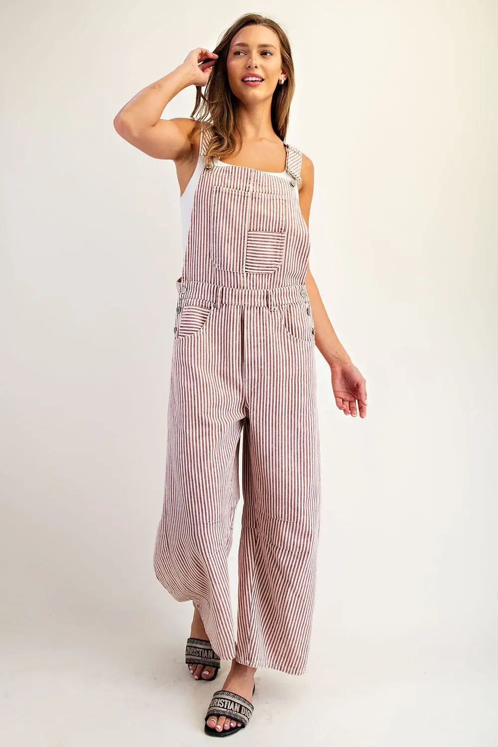 Product Detail: This mineral washed striped jumpsuit features a relaxed barrel leg silhouette with adjustable buckle straps, belt loops, mismatched front patch pockets, side hip pockets, back patch pockets, side button closures, and crisscross back straps for a playful, utilitarian take on classic overalls.