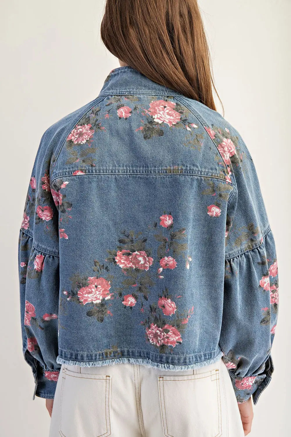 Product Detail: This enzyme, stone, bleach and mineral washed denim jacket features a soft floral print throughout, a button up front with a band collar, gathered balloon sleeves with buttoned cuffs, flap front patch pockets, and a raw frayed hem for a romantic meets casual look.