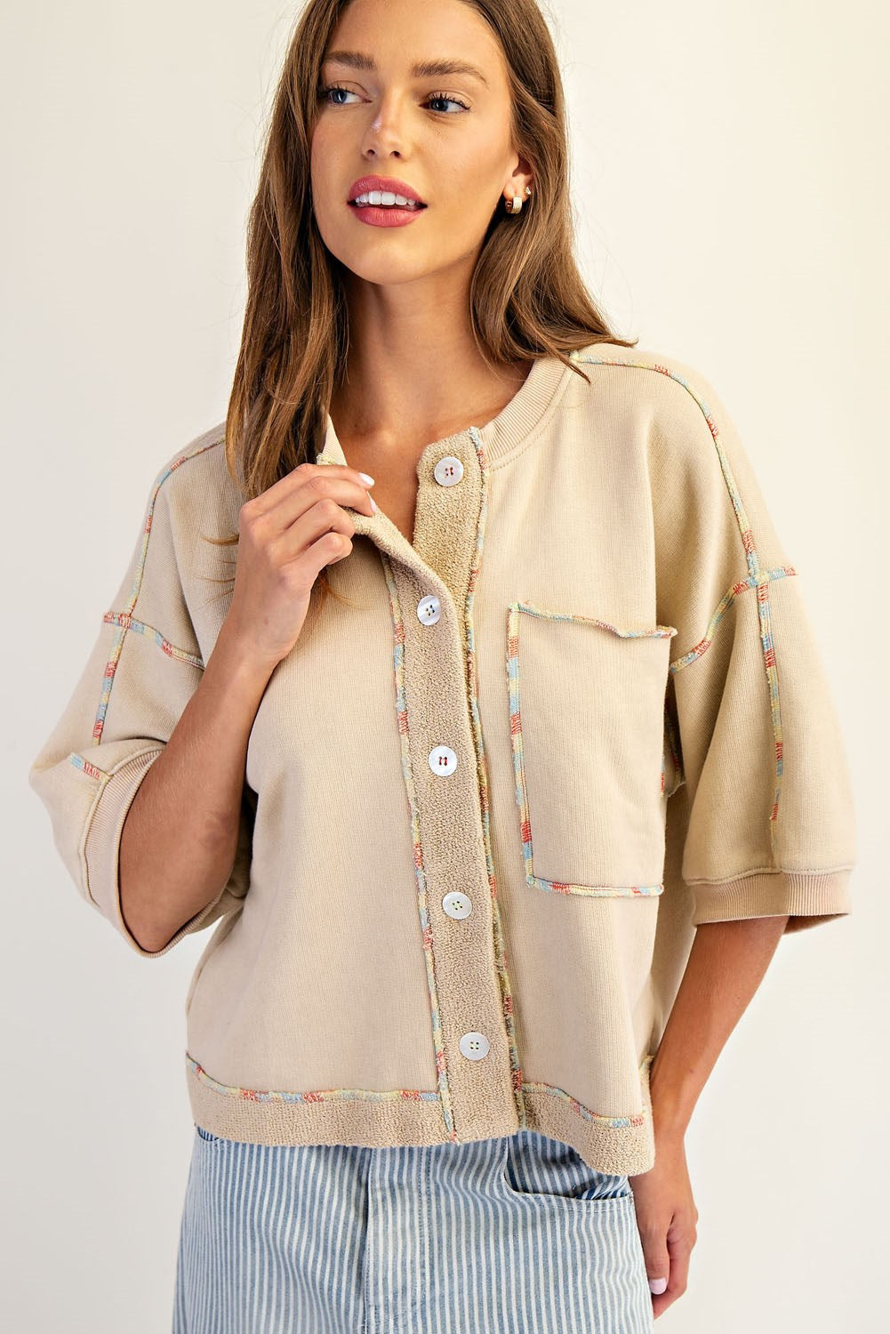 This enzyme washed top brings a pop of fun with its multicolored textured contrast trim and a handy front patch pocket. Cozy French terry fabric meets playful button placket and hem details, while dropped shoulders and wide elbow-length sleeves add a relaxed, lived-in vibe perfect for easygoing days.