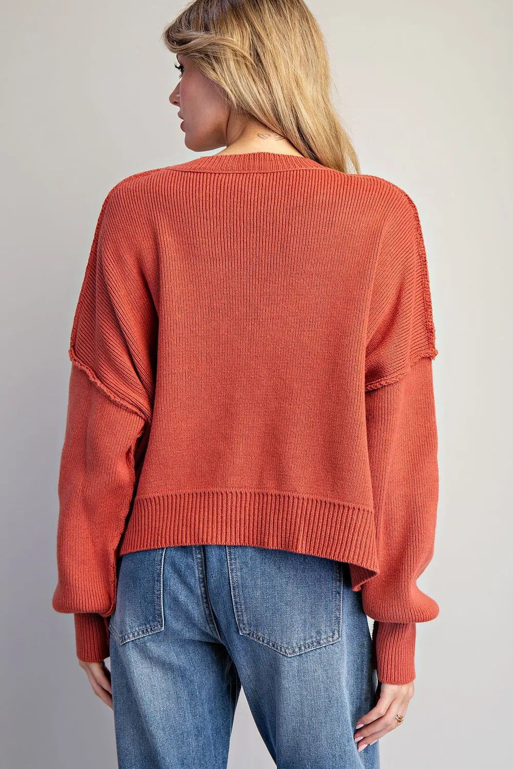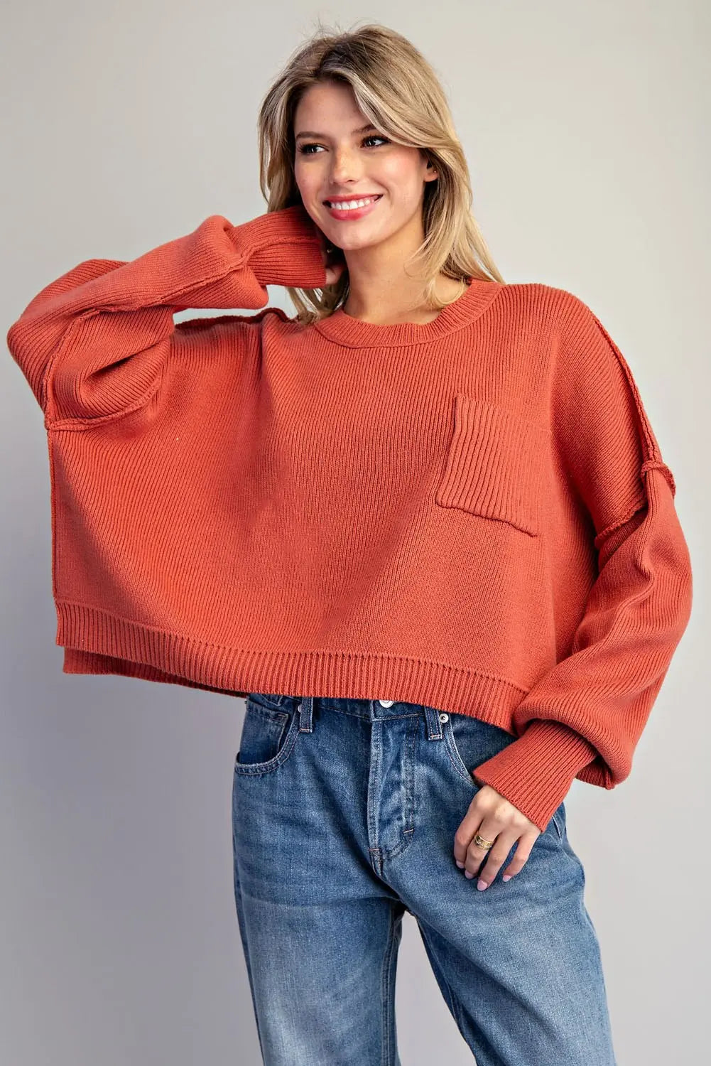Product Detail: This cropped knit sweater features dropped shoulders, contrast ribbed texture at the chest pocket and sleeves, and a relaxed fit with a raw edge hem for an easygoing, elevated essential.
