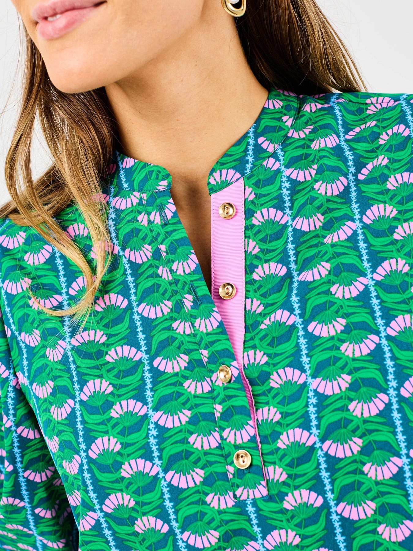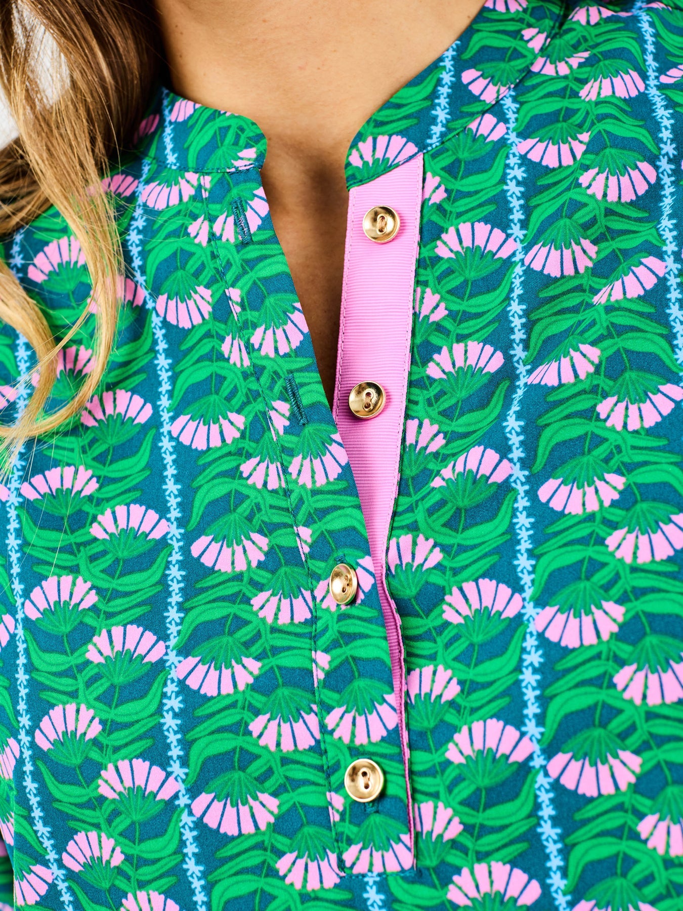 - Contrast ribbon trim at placket