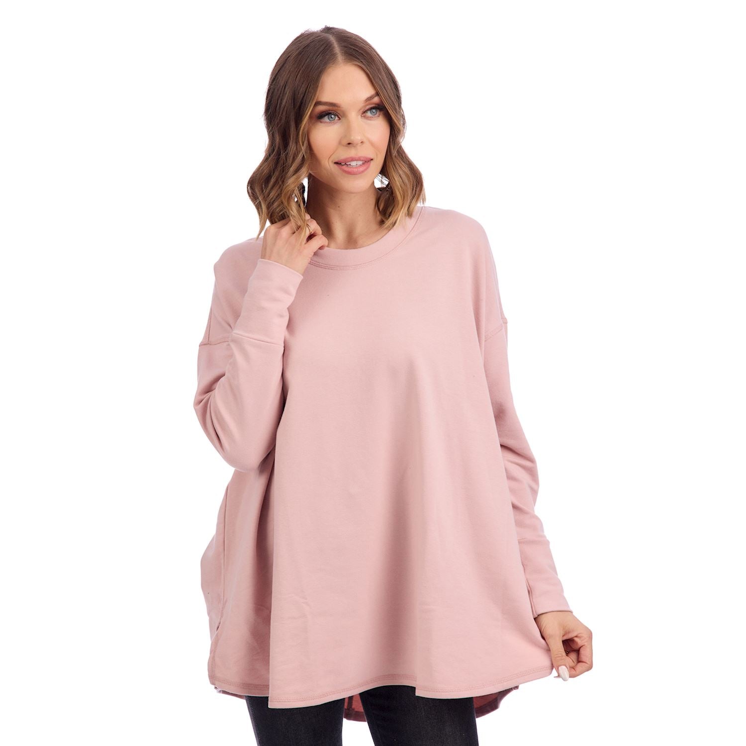 • Cotton poly spandex with dolman sleeves and swing hem