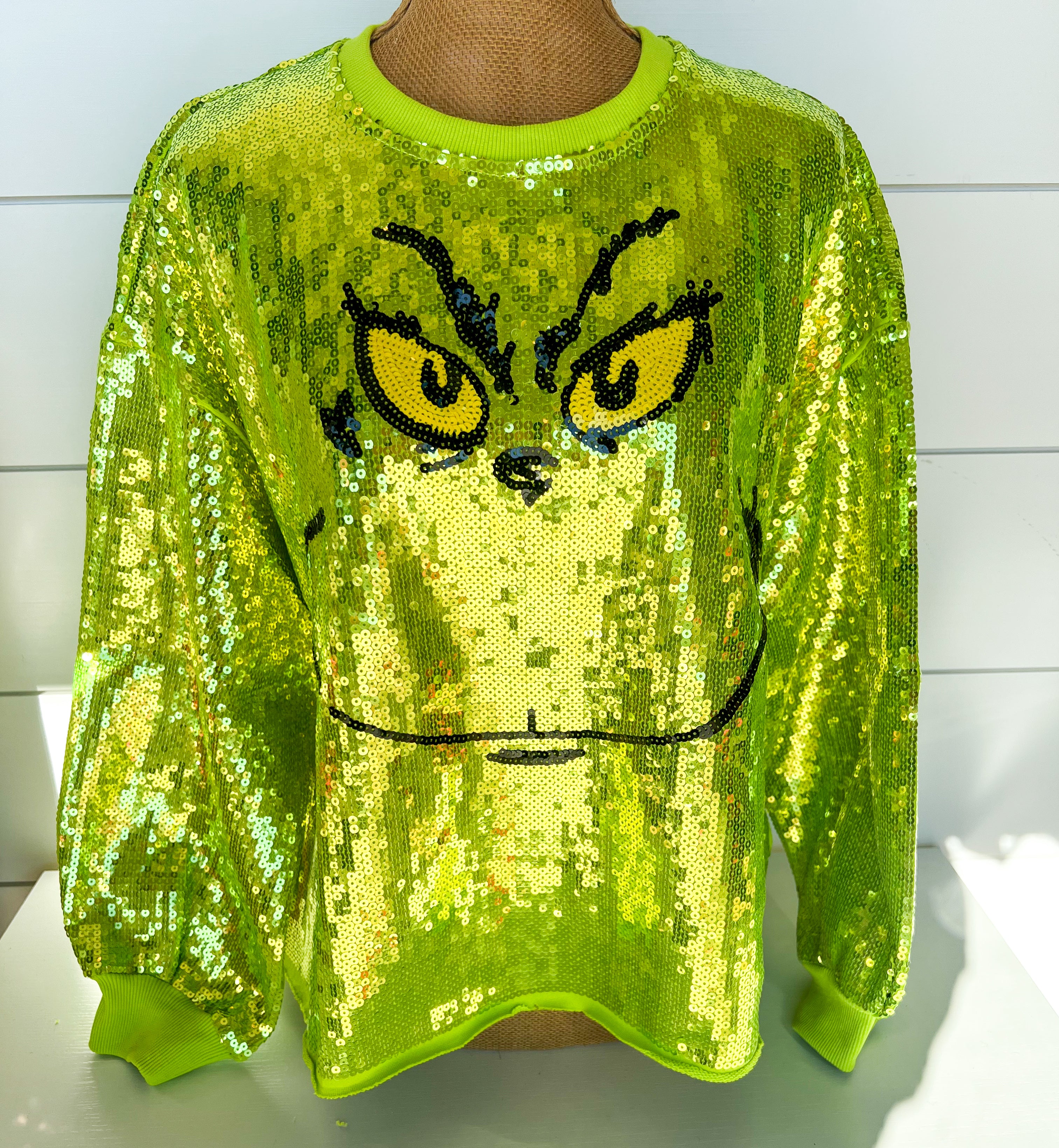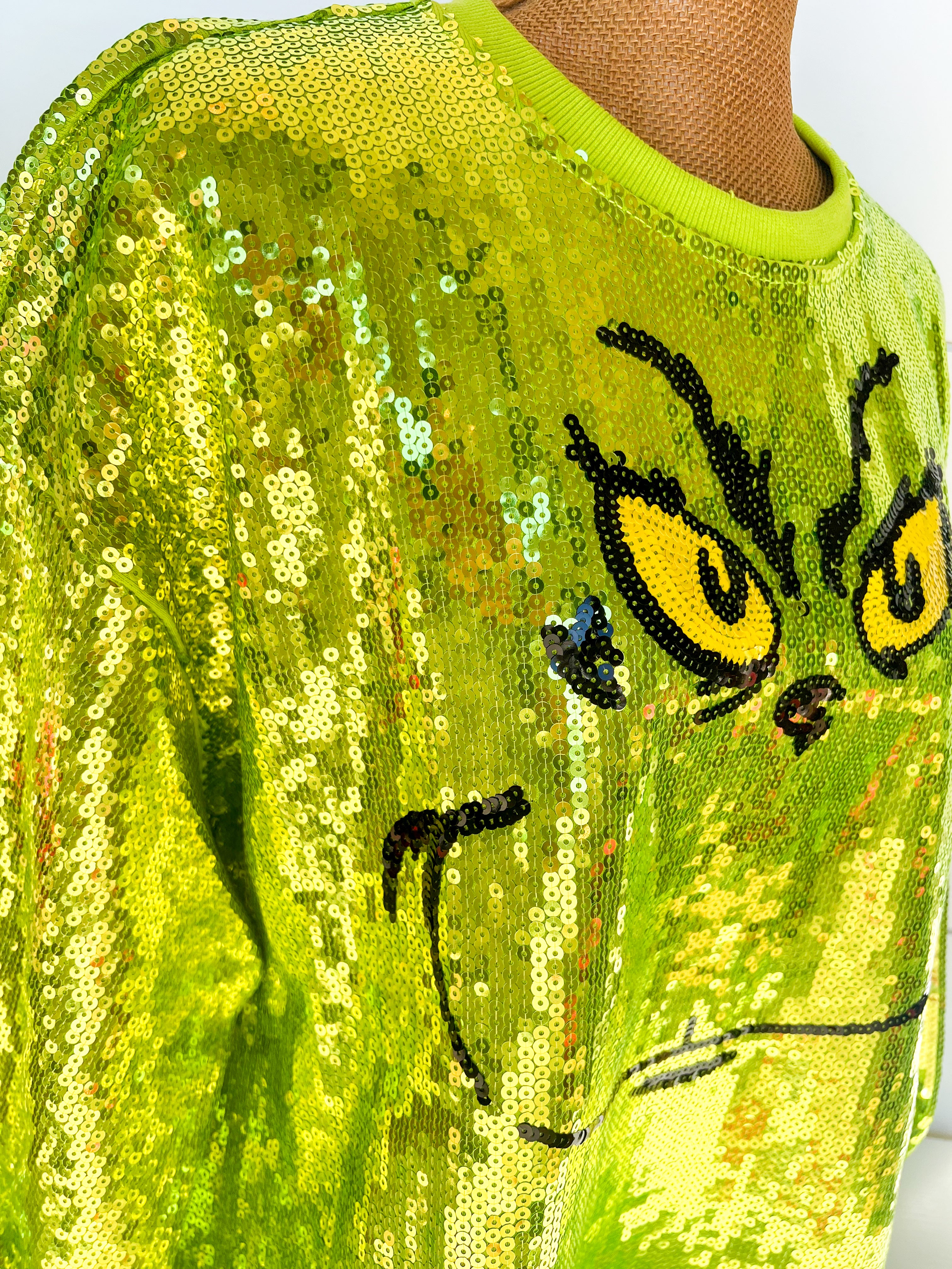 Turn heads this holiday season with our QOS Green Grinch Full Sequin Sweater! This eye-catching piece features an all-over sequin design and an embroidered Grinch face, perfect for adding festive cheer to any outfit. Stand out in style and spread some holiday joy with this unique and fun sweater.