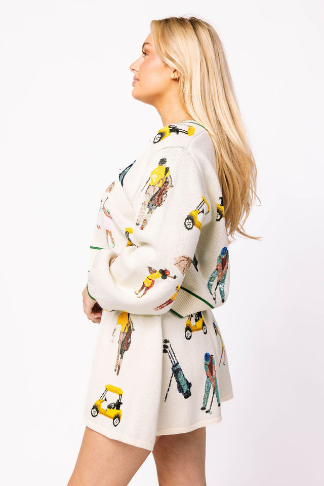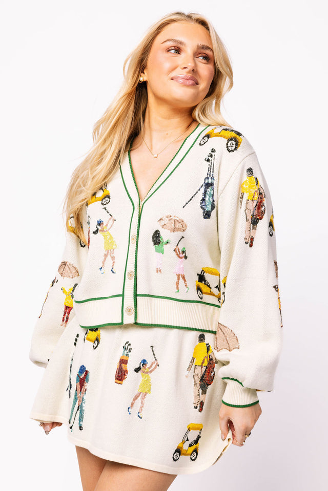 Sparkle on the green with our White Multi Golf Icon Cardigan! This playful knit cardigan features shimmering sequin golfers and a slightly oversized fit. Complete the look with our matching skirt for a stylish and unique ensemble. Perfect for the golf course or a day out with friends!