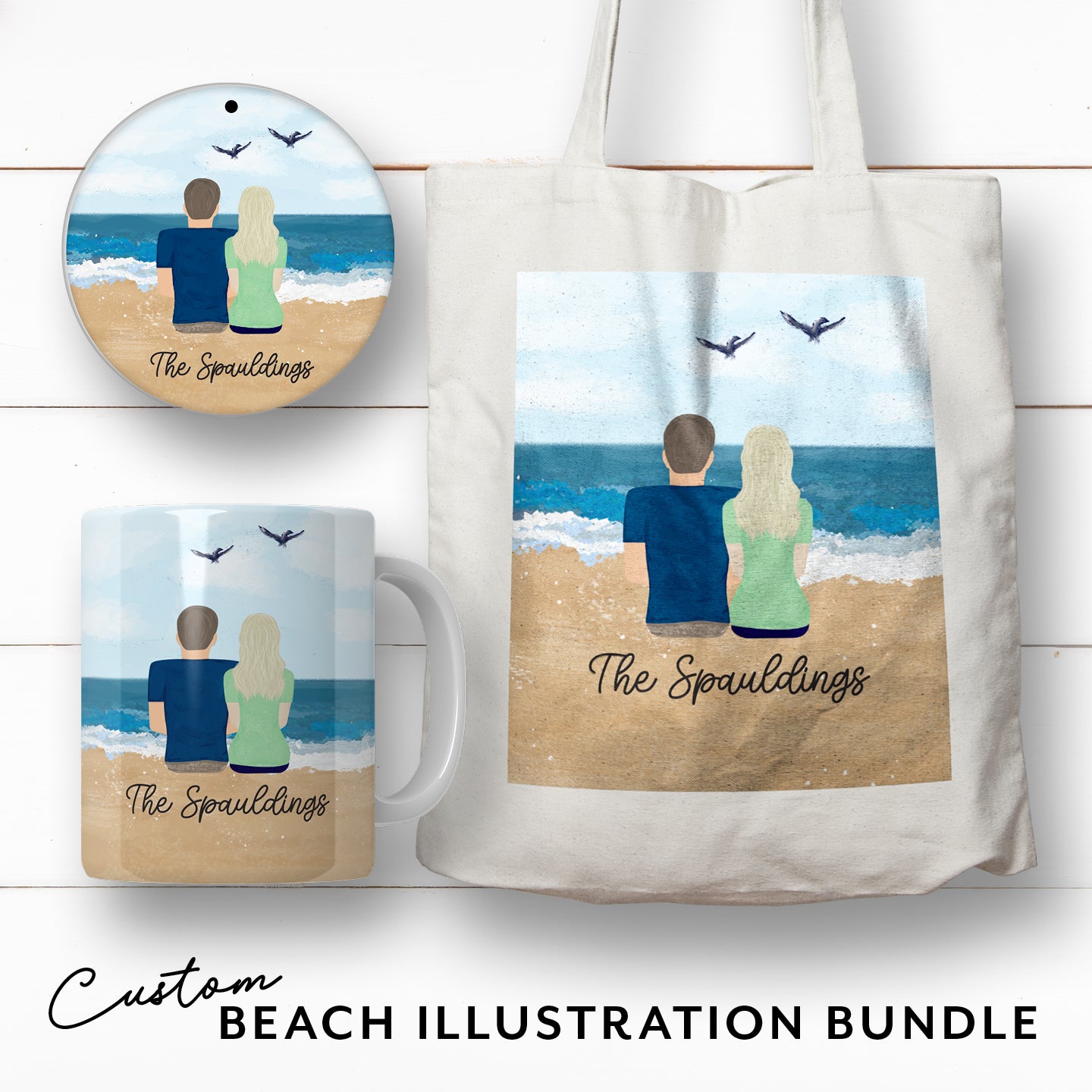 The Custom Beach Illustration Bundle includes one 15"x16" canvas tote bag, one ceramic coffee mug, and one ceramic Christmas ornament.*