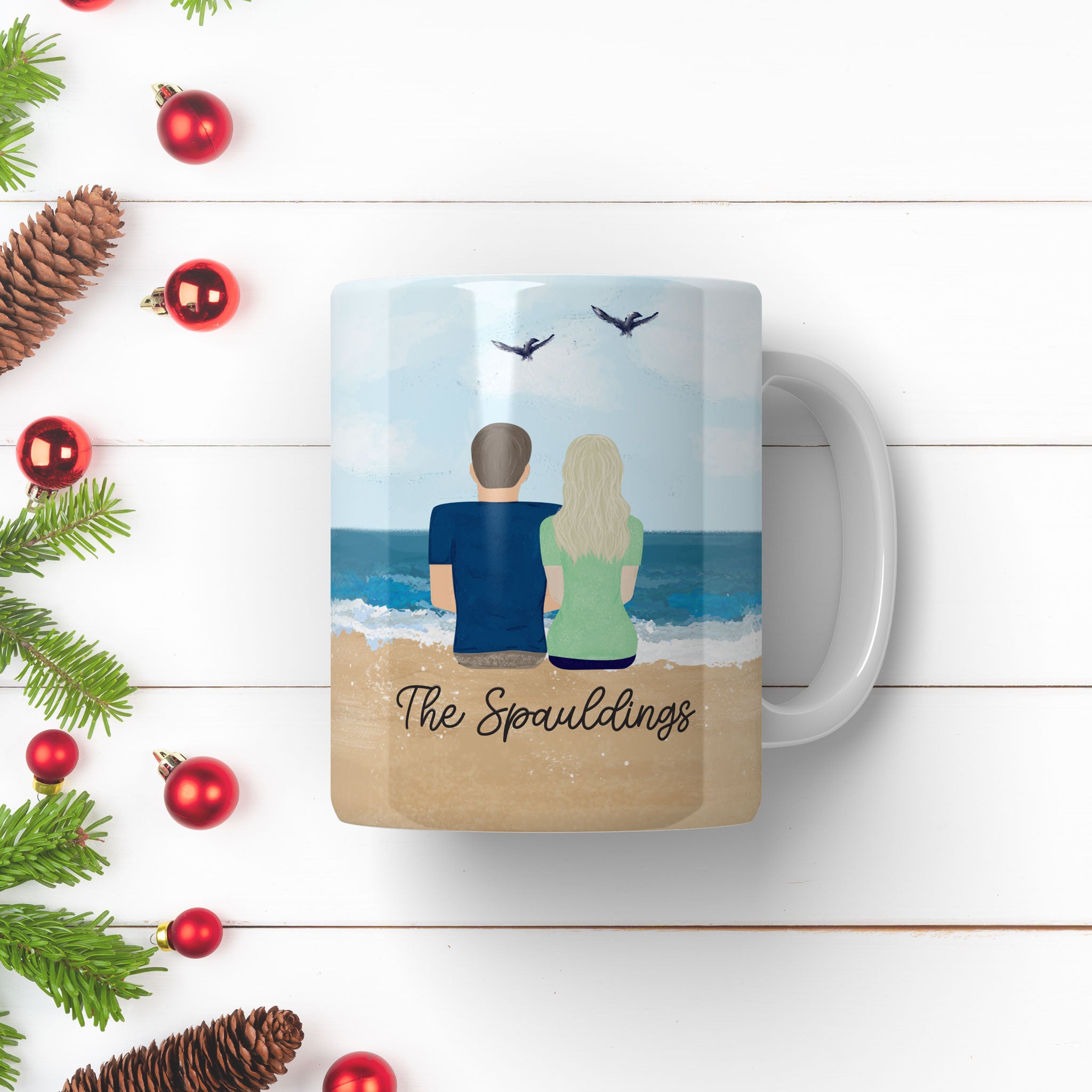 Personalized ceramic coffee mug with one couple and last name. You can pick your skin color, hair color, and hairstyle! This is a great personal gift for newlyweds, engaged couples, and married couples.