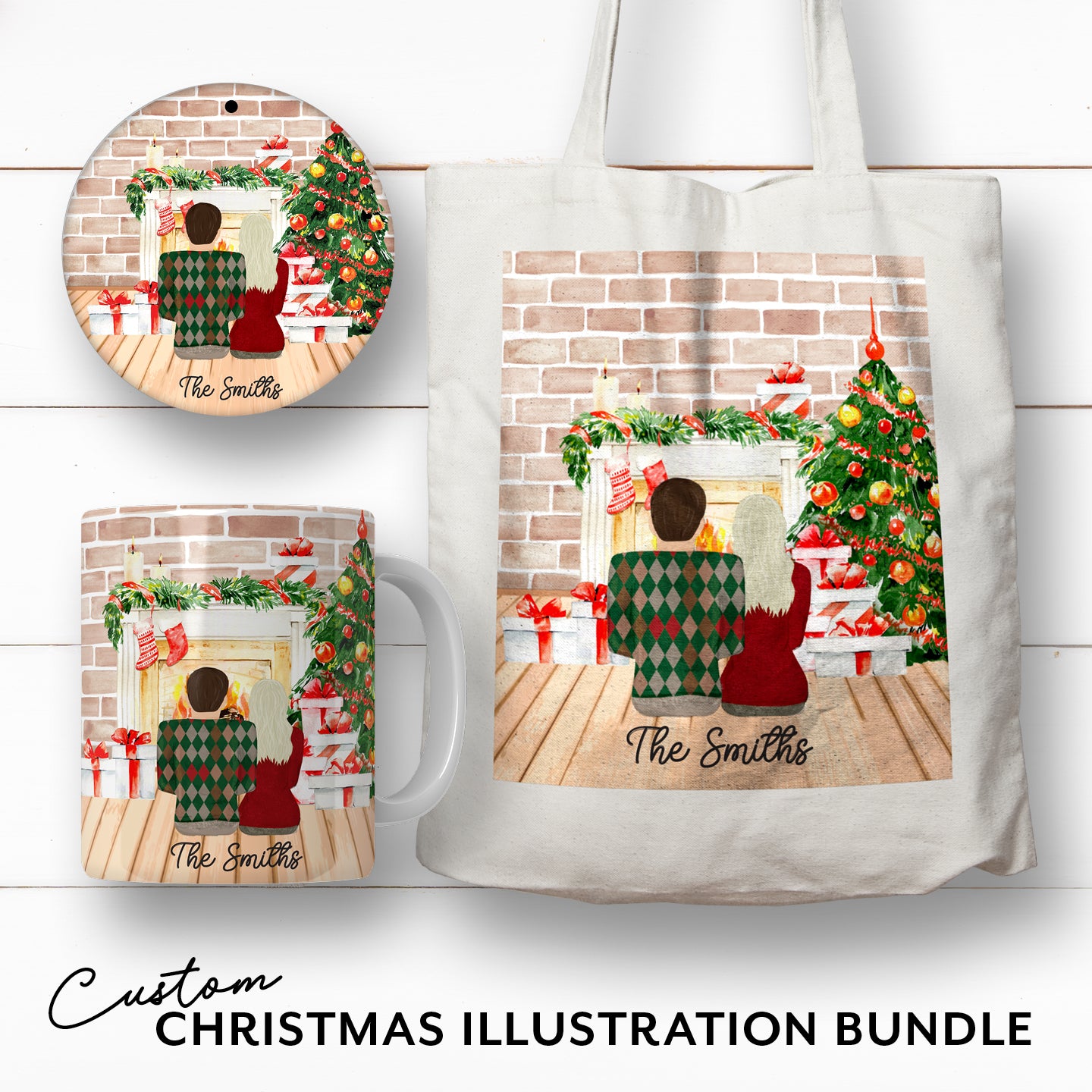 The Custom Christmas Illustration Bundle includes one 15"x16" canvas tote bag, one ceramic coffee mug, and one ceramic Christmas ornament.*