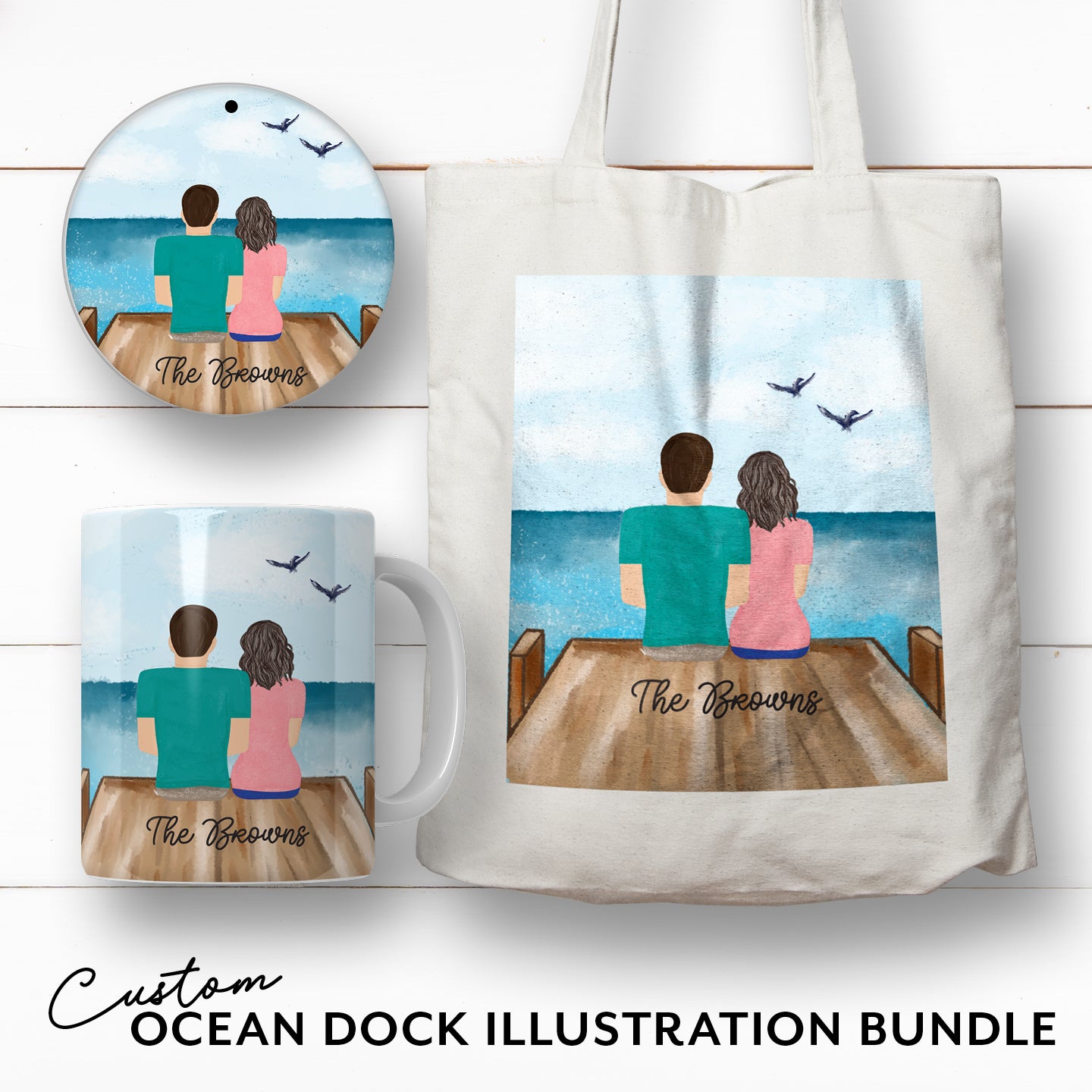 The Custom Ocean Dock Illustration Bundle includes one 15"x16" canvas tote bag, one ceramic coffee mug, and one ceramic Christmas ornament.*