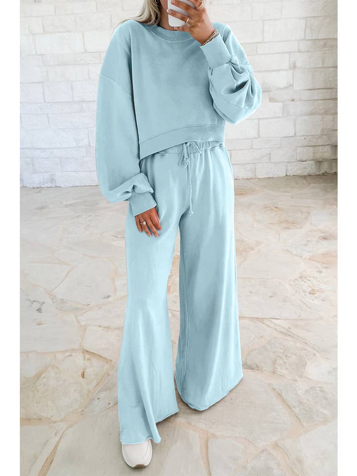 Get ready to make a statement with the Drop The Act Sweatpant Set in blue. This dynamic duo pairs a cropped long sleeve top with stretchy elastic flare sweatpants for a look that's equal parts comfy and fashion-forward. The flared silhouette brings retro flair while the cropped length keeps things modern and fresh. Wear it as a coordinated set for maximum impact, or mix and match with your existing wardrobe. Perfect for days when you want to feel put-together without sacrificing that cozy-day comfort.