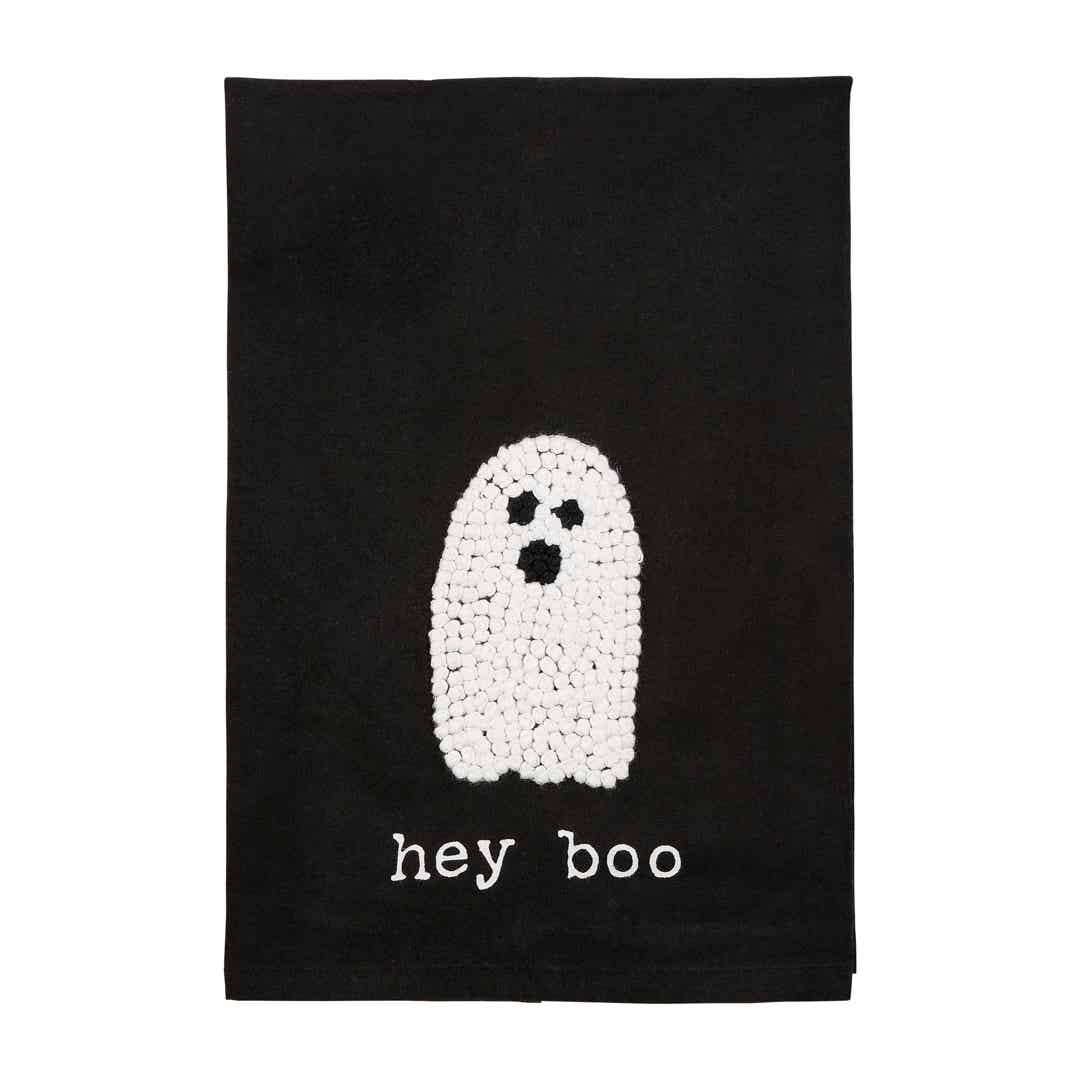 Hey boo, you'll love our Hey Boo Halloween Hand towel. The cotton hand towel features a chunky French knot icon in the shape of a ghost. The hand towel has a black background with an image of a ghost in the center. Underneath the ghost the hand towel reads "hey boo".