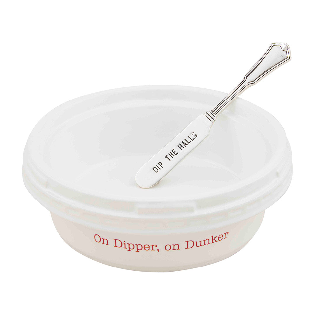On dipper, on dunker? You need this Holiday Story Bought Dip Set. The two piece set comes with a ceramic dip bowl that reads "on dipper, on dunker". The dip bowl is perfectly sized to hold cold case dip containers. The dip bowl comes with a silver-plate spreader that reads "dip the halls".