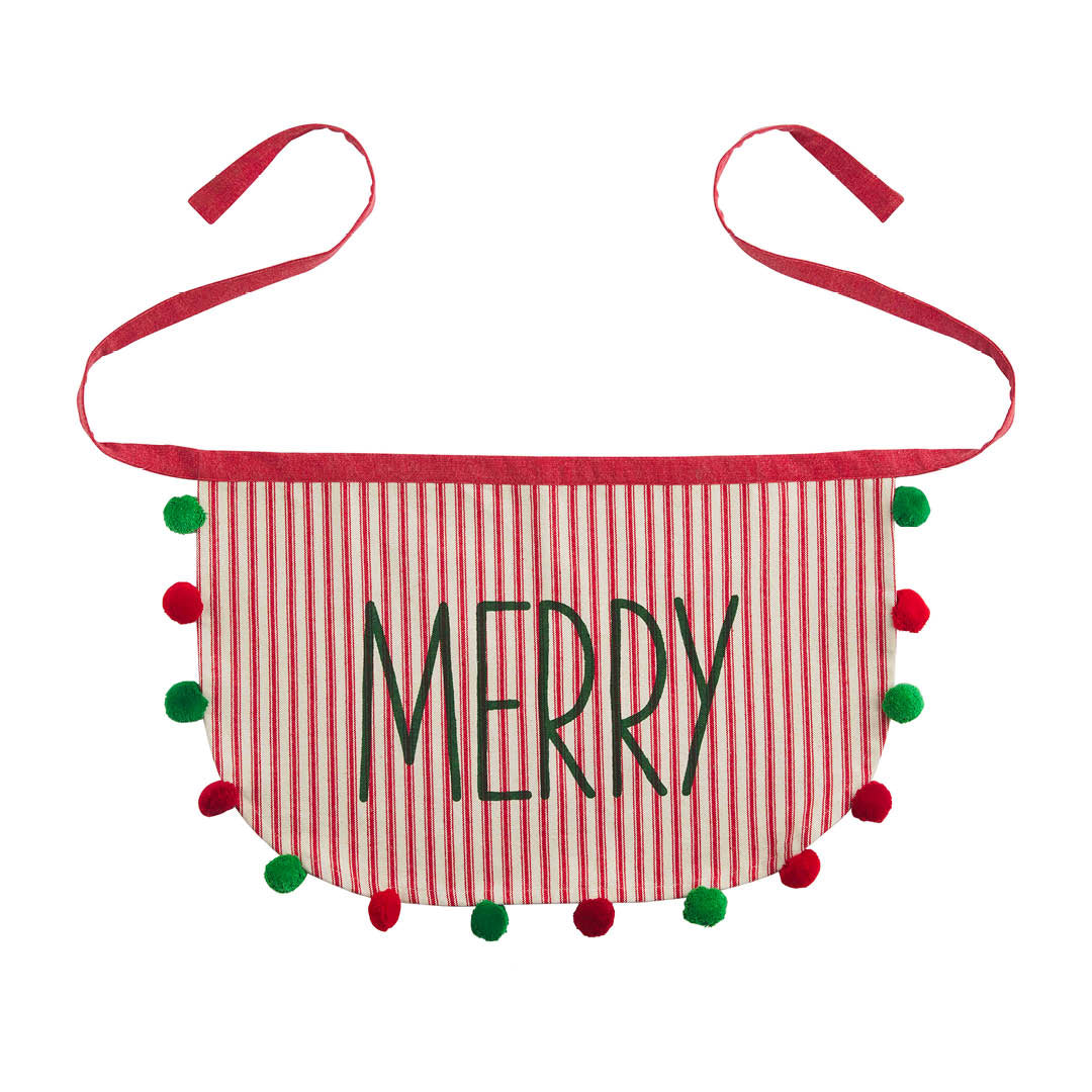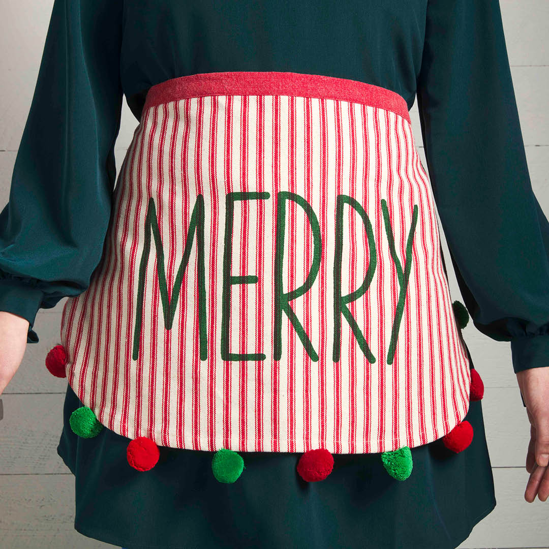 You'll be dashing through the dough in our Merry Pom Pom Apron. The washed canvas half apron features a yarn pom trim. The body of the apron features a red and white striped pattern. The center of the apron features the sentiment "Merry". The pom trim features festive Christmas colors.