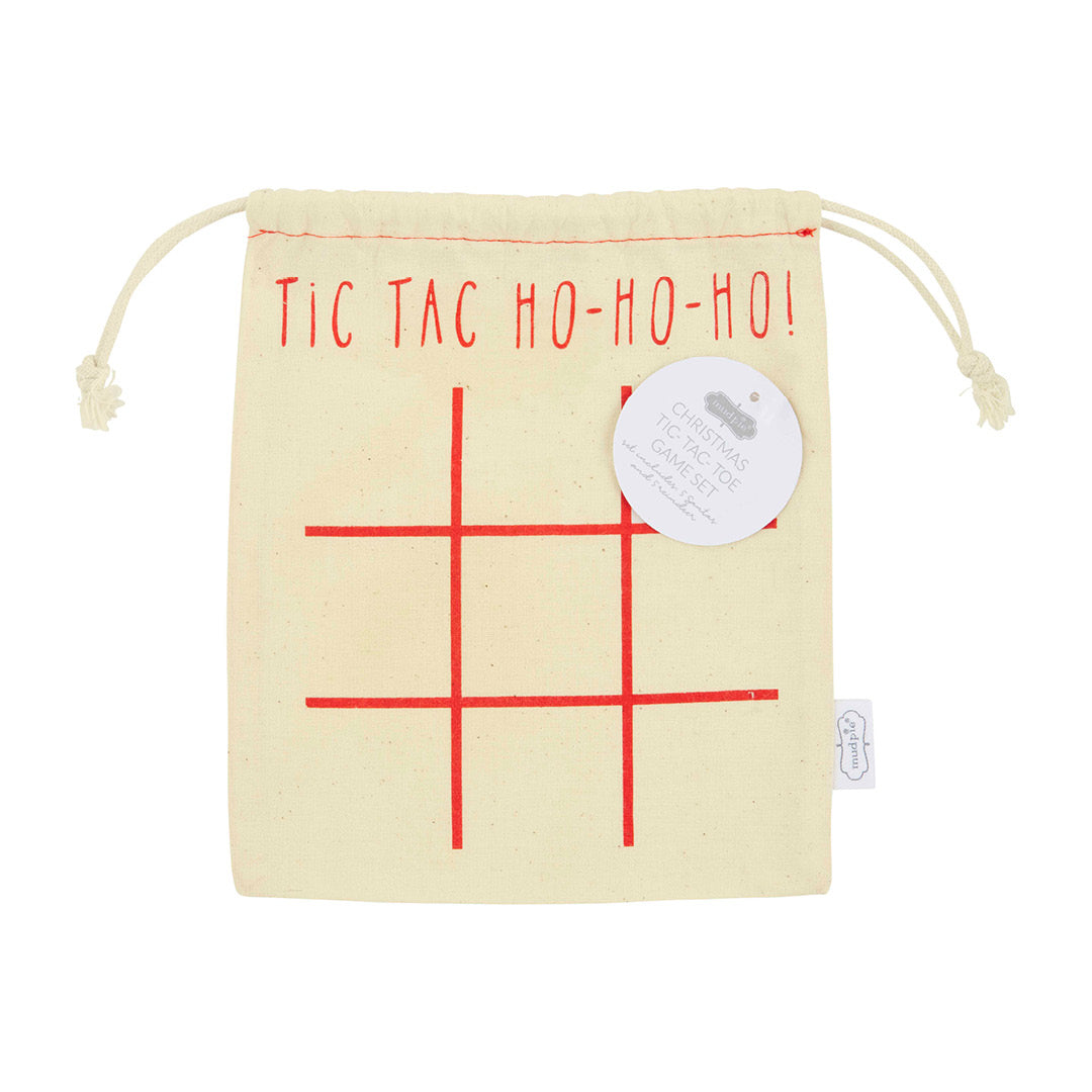 Muslin tan drawstring bag features printed tic-tac-toe board and holds five poly resin reindeer and Santa character game pieces. Ages 6 and up.