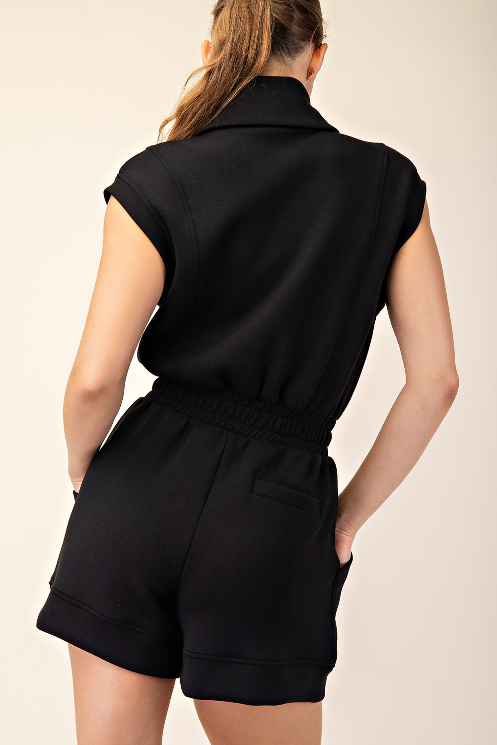 Slip into the Fresh Start Luxe Sleeveless Romper and discover your new go-to piece. This playful one-piece features a show-stopping oversized collar and clever diagonal pockets that keep things interesting. Crafted from our signature Modal Poly Span Scuba fabric, it's silky soft, breathable, and boasts 4-way stretch for all-day comfort. The dropped armhole and elastic waistband create an effortlessly chic silhouette that works from brunch to evening plans. Pull it on and feel the difference quality makes.