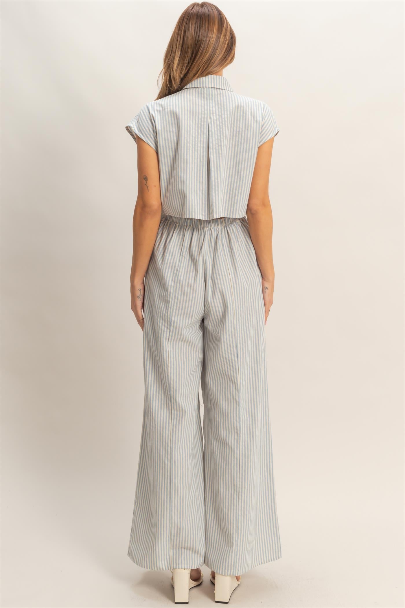 Effortlessly chic and undeniably fun, this striped jumpsuit is your go-to for making a statement. The crisp collared neckline and button-down front keep things polished, while cap sleeves offer a breezy touch. Pleated details bring movement and dimension to the flattering wide-leg cut—no need for separate pieces when one outfit does it all. Slip on strappy heels and you're ready to turn heads. Perfect for brunch, date night, or whenever you want to feel fabulous in one piece.