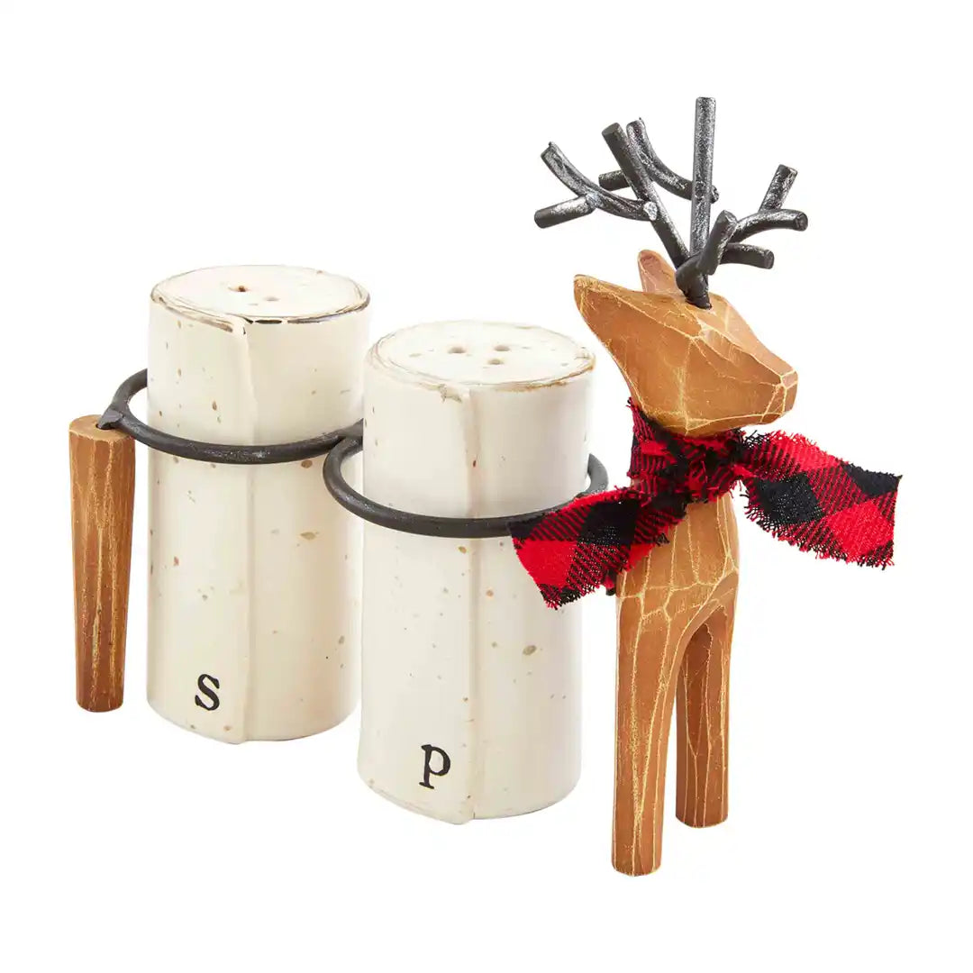 Elevate your home decor with our exquisite Deer Salt and Pepper Set, perfect for adding a seasonal touch. Crafted from durable stoneware, this set includes two dishwasher-safe shakers, nestled in an artfully designed wood and metal deer holder, standing 5 3/4" tall. Spruce up your dining experience with this charming addition to your tableware collection.