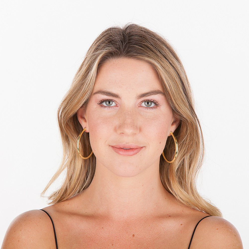 The Smaller Version of our Classic, Handmade in Brazil under the watchful eyes of the finest craftspeople, these hoops are a story years in the making. Brilliantly cast out of a lightweight, strong, blend of metals, the hoops are prepped in a plating facility and hand brushed, one at a time. The result is a hoop weighing less than anything on the market, that will last for a long time, and that looks gorgeous. They were tested by Sheila herself at the beach for days at a time, at galas and at meetings. The ultimate piece for every occasion, they will withstand salt, waves, sun, humidity, you name it, and still exalt style anywhere you go. Our masterpiece in a Smaller Version. And an homage to the Brazilian spirit.