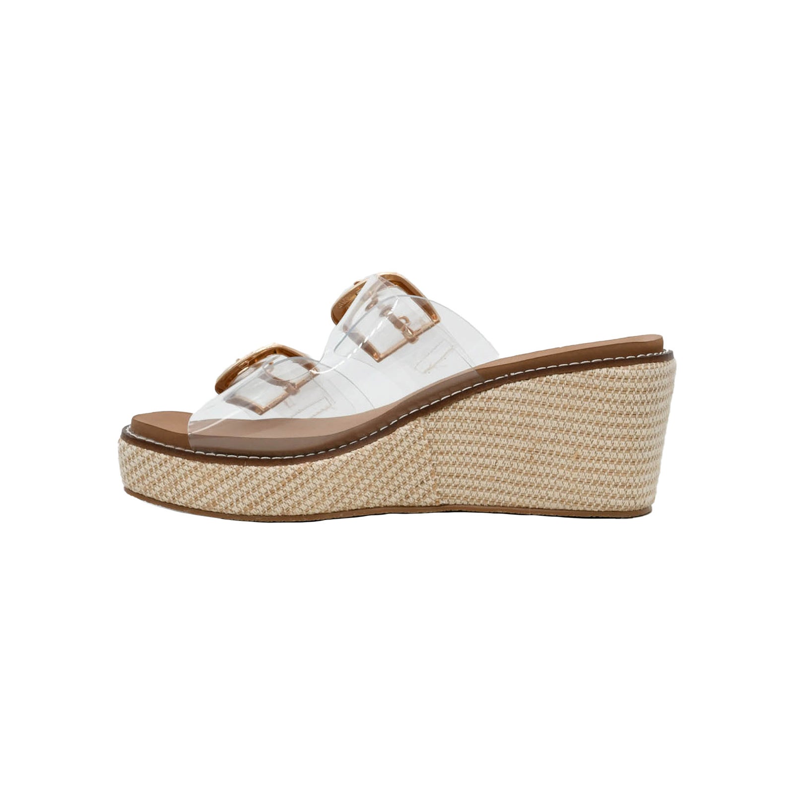 The Manifest Wedge features a sleek clear top with adjustable straps and secure buckles for a customizable fit. The transparent design showcases the shoe's modern construction while the sturdy buckle closures ensure all-day comfort and stability. Perfect for those seeking a contemporary look with practical functionality, this wedge transitions seamlessly from casual outings to elevated occasions. The clear aesthetic pairs beautifully with any outfit, making it a versatile addition to your footwear collection.