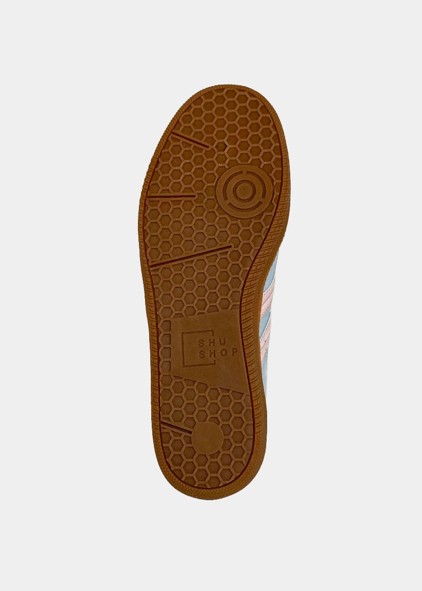 Vintage sneaker lovers, meet your new obsession. The SASHA in Baby Blue combines nostalgic sport vibes with soft pastel tones and subtle texture. Featuring a blend of baby blue faux suede and leather, accented with blush pink faux lizard stripes, this sneaker feels like summer in every step. Whether you're dressing up denim or grounding a flowy dress, SASHA gives you easy style with major retro cool.