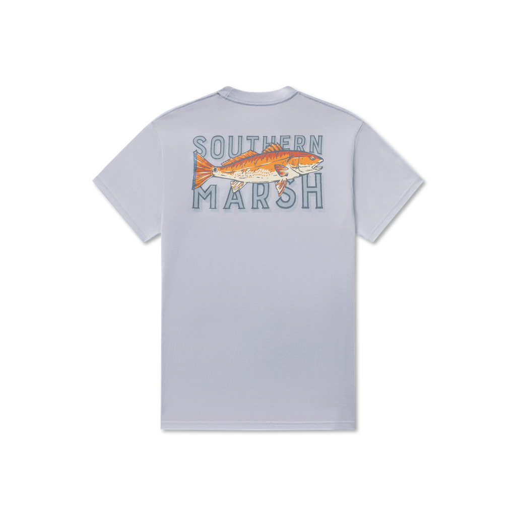 Breathable and lightweight, our SEAWASH™️ Tee - Redfish Catch short sleeve t-shirt features a full color Redfish design over retro style Southern Marsh text on the back and a handy front pocket. Made for comfort and all day wear, this tee is perfect for layering with our fleece pullovers and canvas jackets.