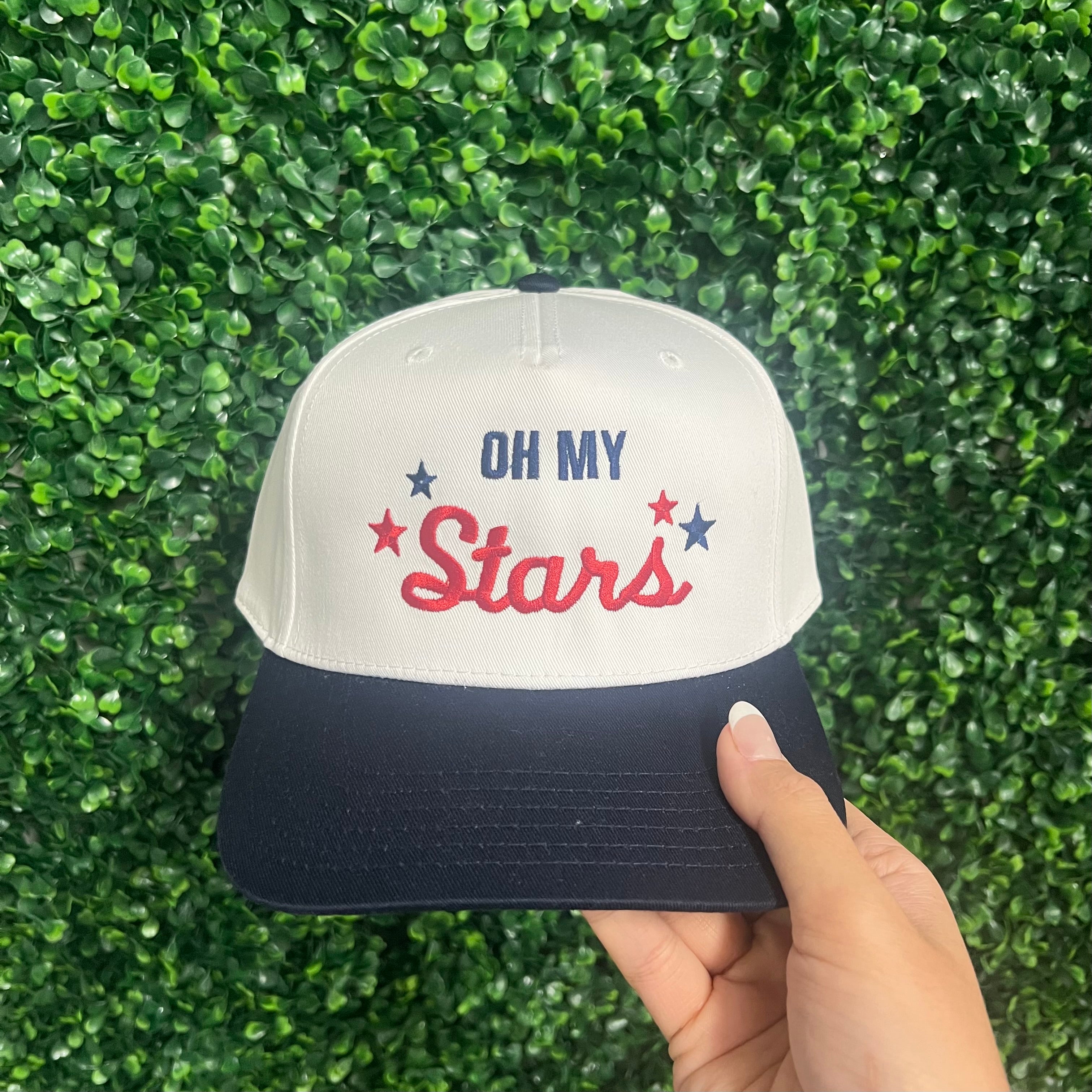Show off your patriotic spirit with this playful navy and white trucker hat. Featuring "Oh My Stars" embroidered on the front alongside charming patriotic stars, it’s the perfect accessory to add a fun, festive touch to any casual outfit. Comfortable and stylish, this hat is ready for your next adventure or celebration.