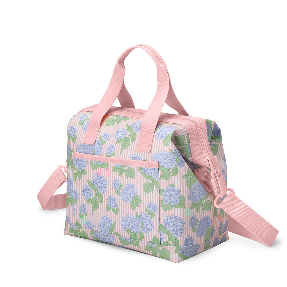 Keep cooler and carry on! 🧊 This print blooms with timeless charm, featuring clusters of soft blue hydrangeas scattered across a delicate blush and white pinstripes background.