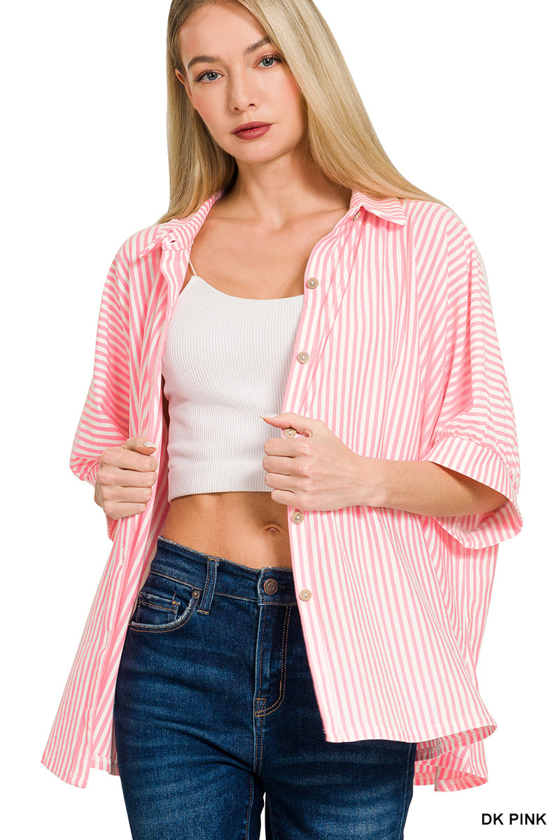 Stripes Away Oversized Button Down that's ready to make a statement. This relaxed-fit essential measures 25.5" from shoulder to hem with a generous 67" bust, giving you that effortlessly cool oversized vibe. Perfect for layering, dressing up with tailored trousers, or keeping it casual with your favorite jeans. The timeless stripe pattern pairs with everything in your closet, making it the kind of piece you'll reach for again and again. Measurements taken from S/M.