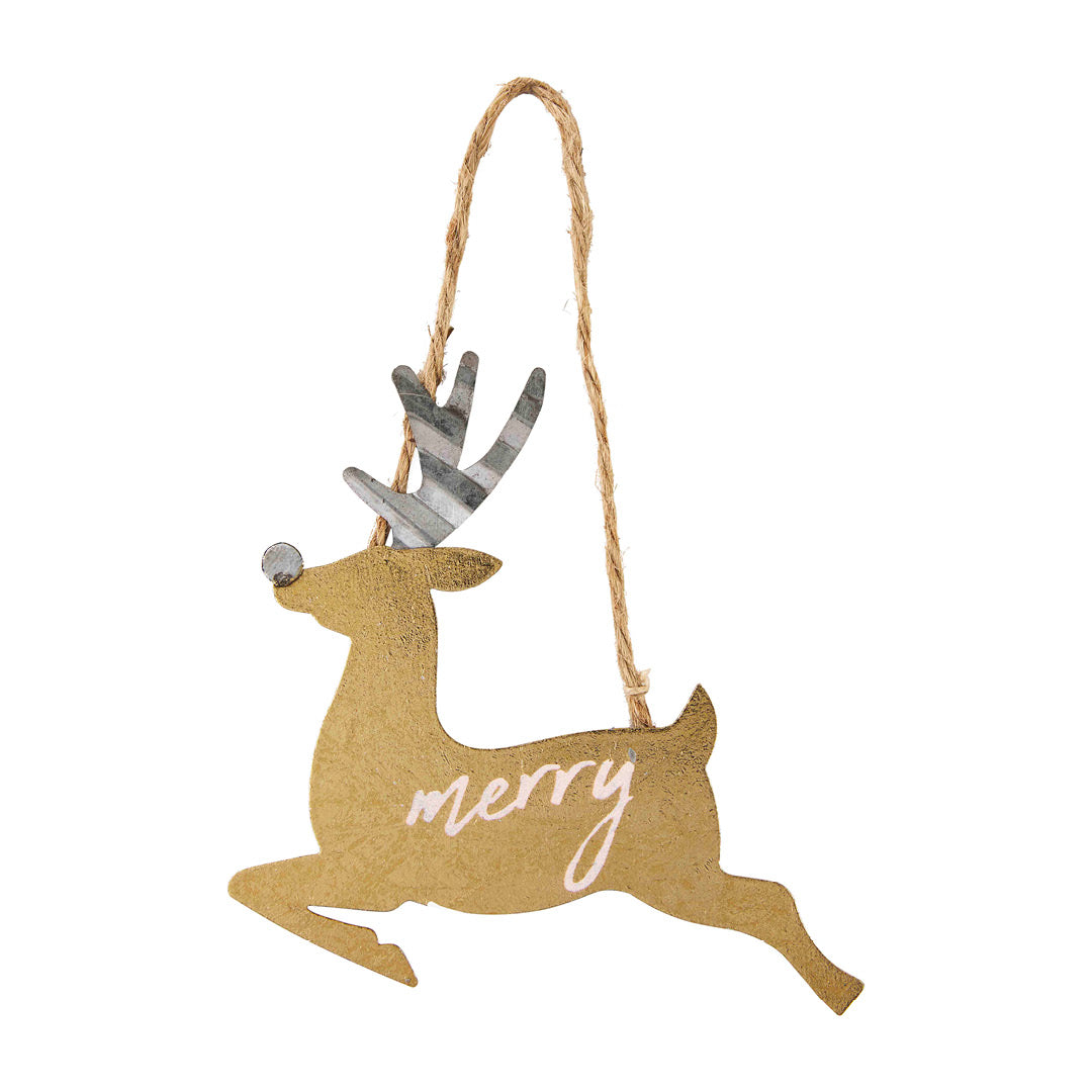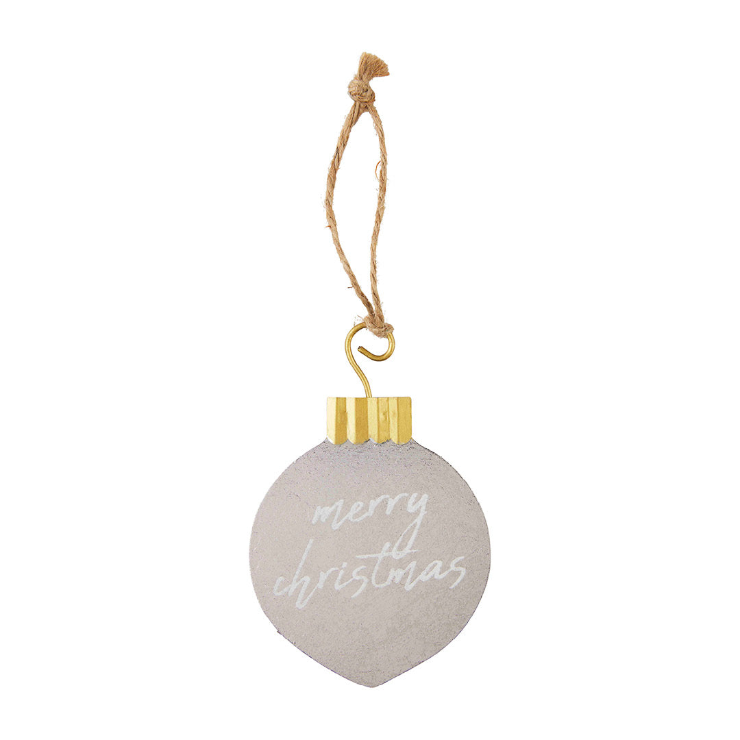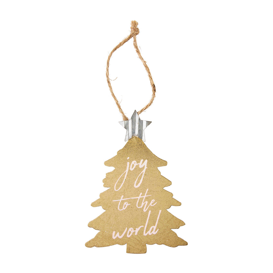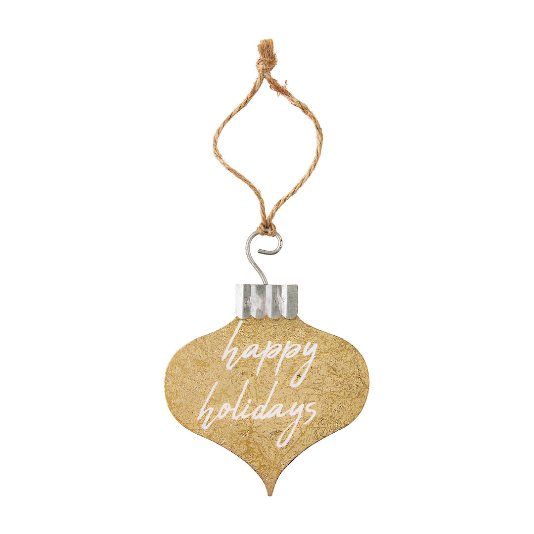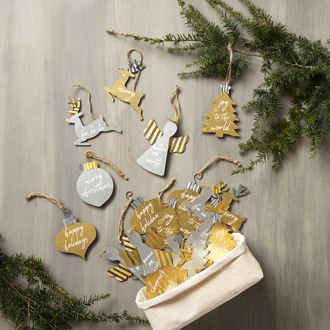 Metallic christmas ornaments in classic holiday shapes, twine, and seasonal greeting. Sold individually.