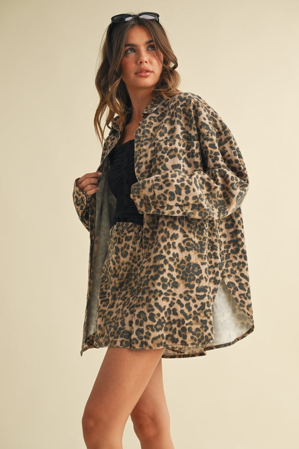 Unleash your wild side with this oversized shacket that refuses to play by the rules. Featuring a bold leopard print in warm tan tones, it's the perfect layer for anyone who loves making a statement. Throw it over anything—dresses, tees, or tanks—and instantly elevate your look with effortless edge. Roomy enough to wear solo or styled over your favorite pieces, this shacket is your new go-to for that "I woke up like this" vibe. Can't be tamed? Neither is this piece. Get the matching set, search Can't Be Tamed Leopard Mini Skirt.