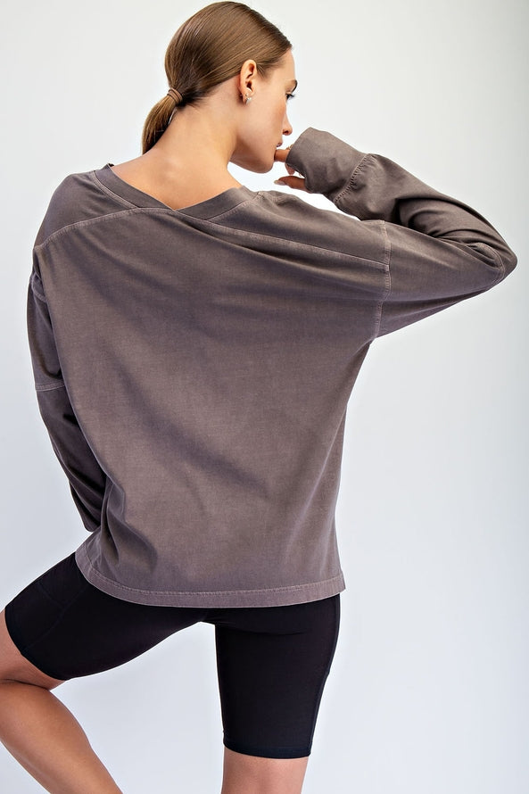Soft, breathable, and quietly detailed-this pigment-washed V-neck top brings ease and edge together. It's relaxed but never ordinary. The kind of piece that slips on and instantly elevates your everyday.